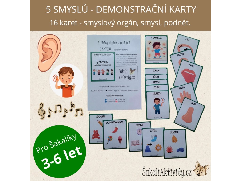 Demonstrační karty od www.ŠakalíAktivity.cz slouží k přehlednému a srozumitelnému seznámení dětí s pěti smysly lidského těla, smyslovými orgány a předměty, které jednotlivými smysly vnímáme. Aktivita je vhodná pro děti předškolního věku i děti v raném školním období.