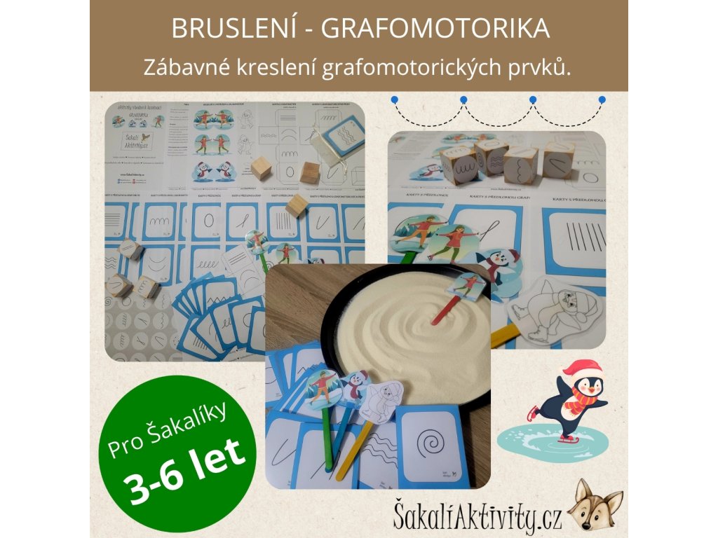 Soubor obsahuje 24 základních grafomotorických prvků, ke kterým patří demonstrační předlohové karty s motivy a obrázkové postavičky (bruslaři) k nalepení na špejli, tužku nebo jinou pomůcku. V sadě najdete i dvě hrací kostky, které se využívají při hře – dítě hodí kostkou a kreslí zvolený grafomotorický tvar. Můžete kreslit klasicky na papír, ale doporučujeme vyzkoušet i zábavnou formu tzv. „bruslení v krupici“ nebo jiné sypké hmotě.
