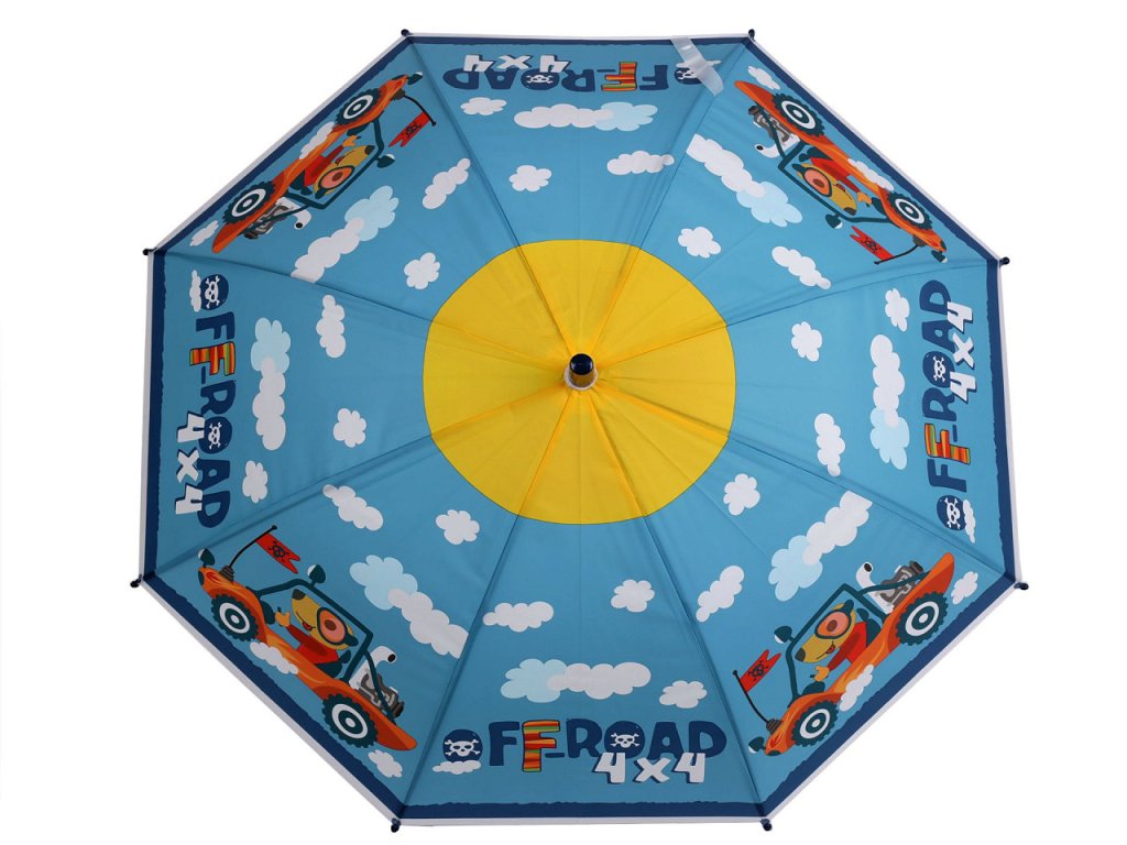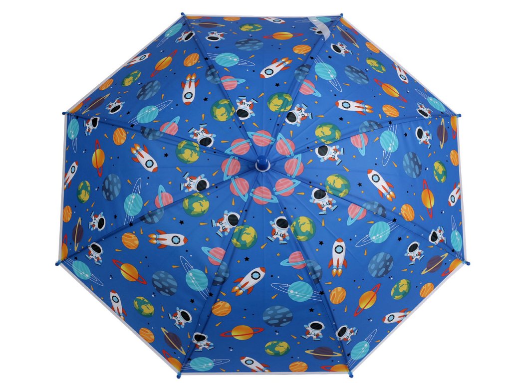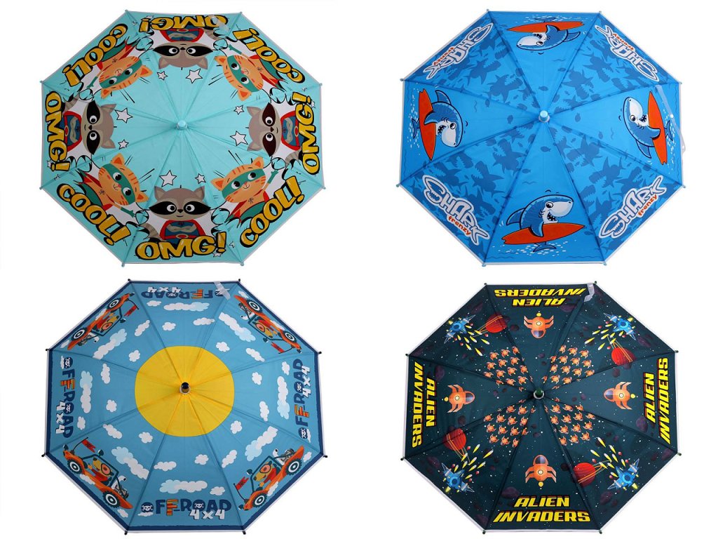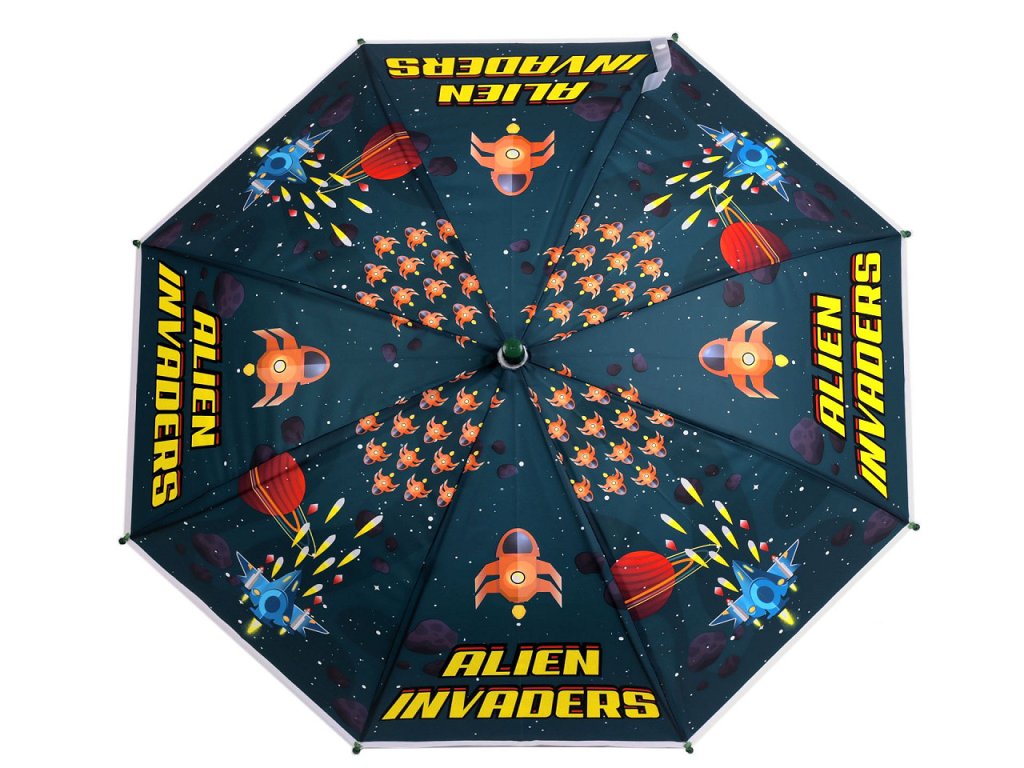 Chlapecký vystřelovací deštník s pestrobarevným potiskem. Deštník má klasickou tyč zakončenou pevnou rukojetí.