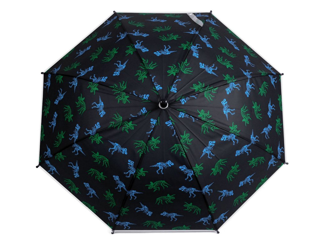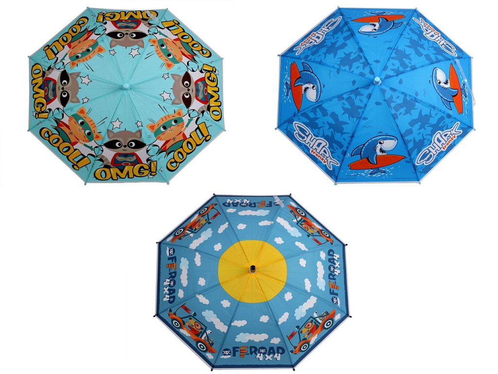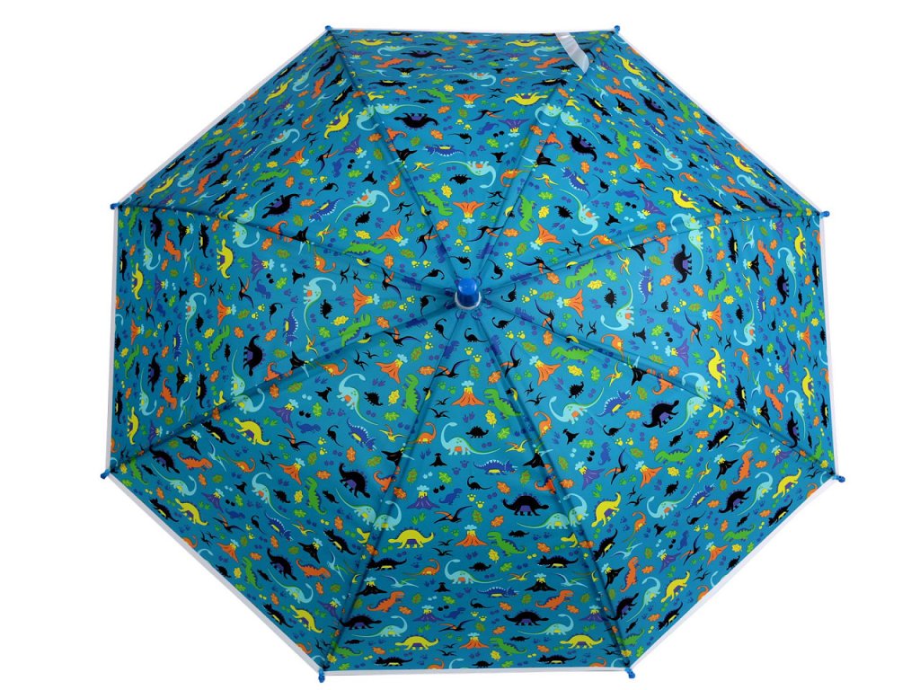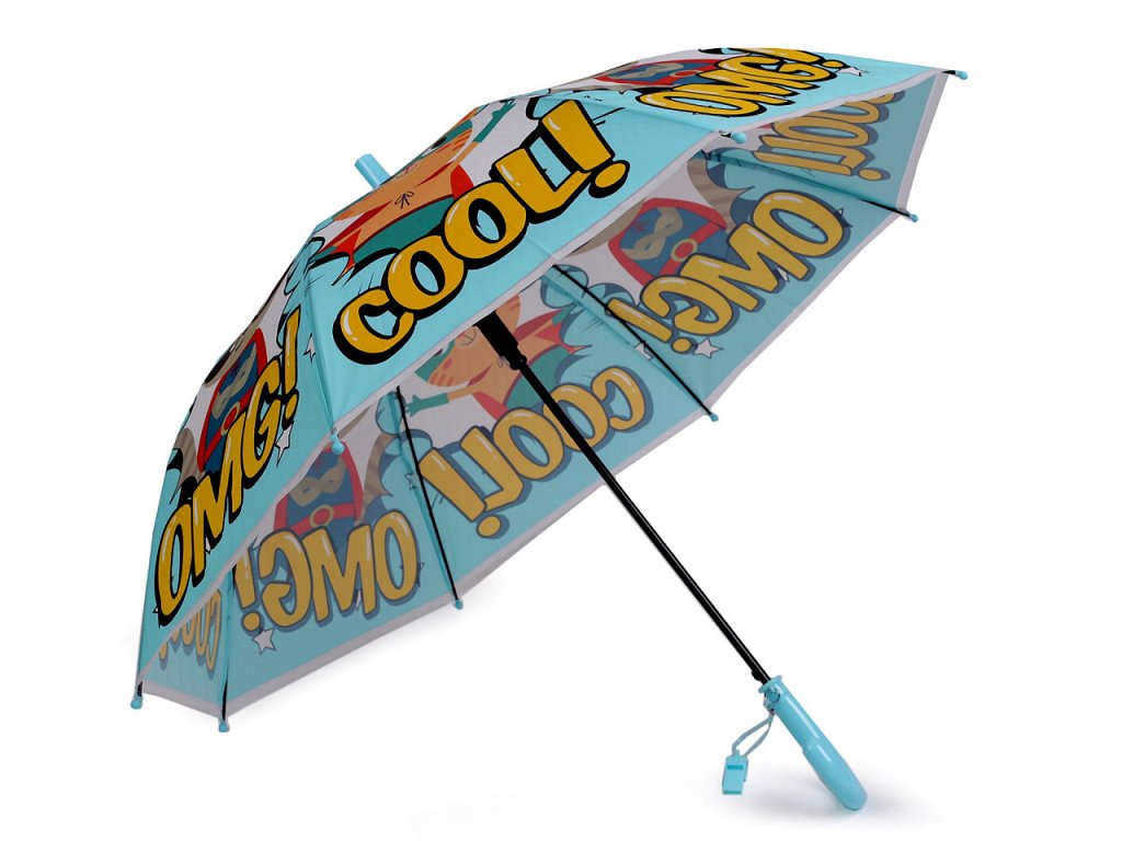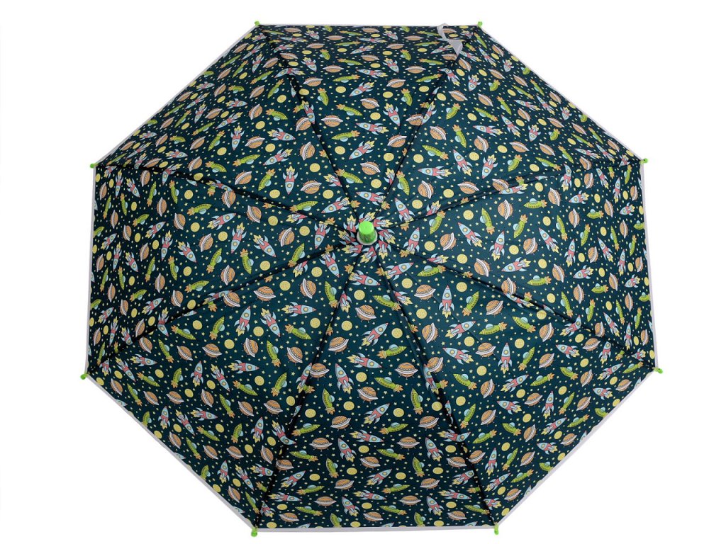 Chlapecký vystřelovací deštník s pestrobarevným potiskem. Deštník má klasickou tyč zakončenou pevnou rukojetí.