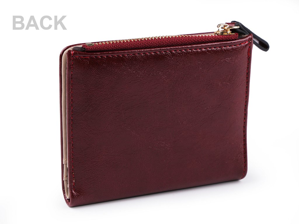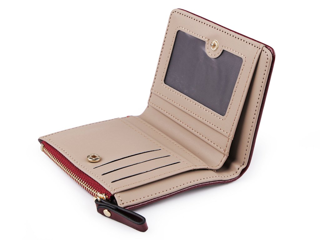 Přední strana peněženky se zapíná na patentku. Uvnitř najdete 7 přihrádek na kreditní karty, z toho je jedna průhledná a přihrádku na bankovky.