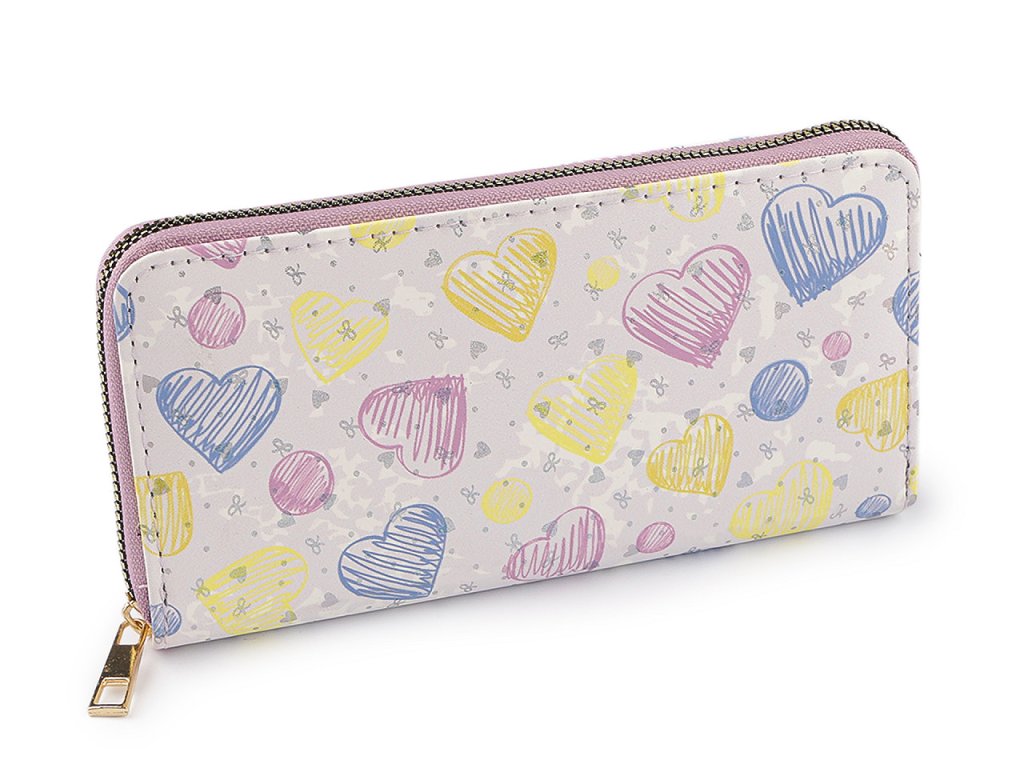Peněženka s potiskem srdíček je elegantním a stylovým doplňkem. Upoutá pozornost i díky svému třpytu, který způsobují malá metalická srdíčka a mašličky v potisku. Peněženka obsahuje jednu hlavní kapsu, která se zapíná na kovový zip.