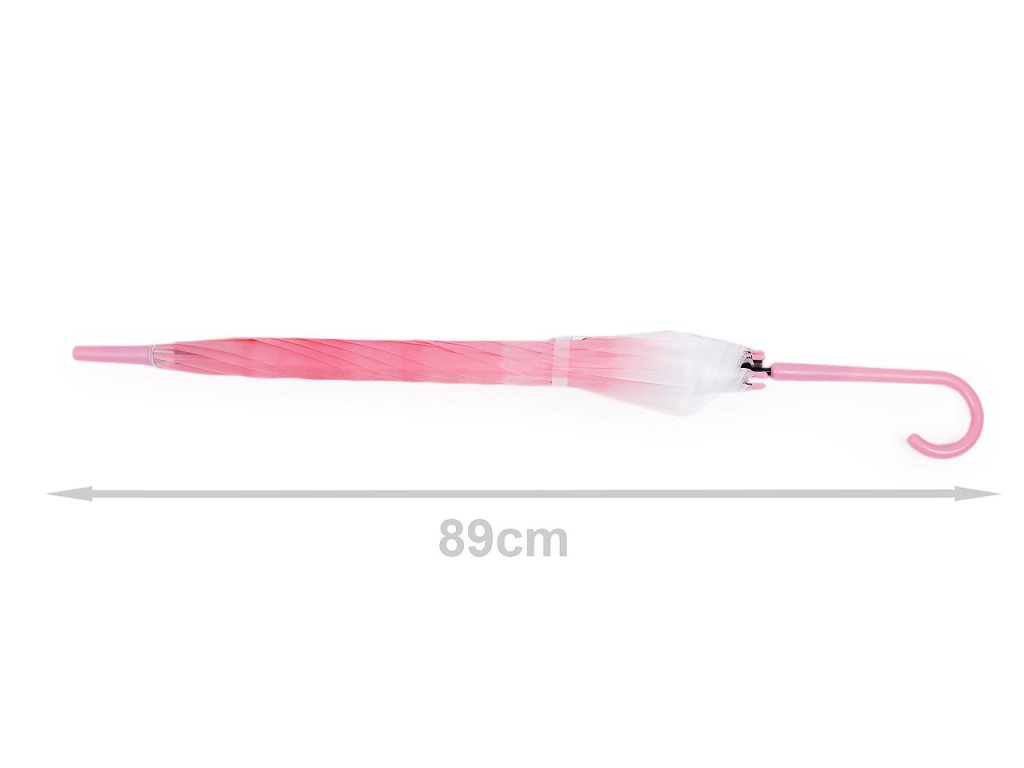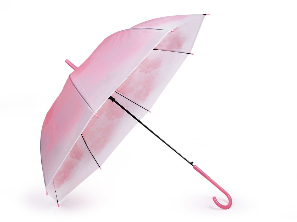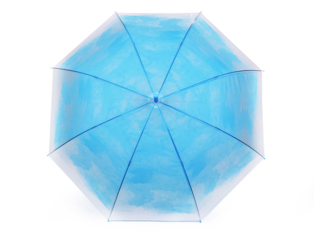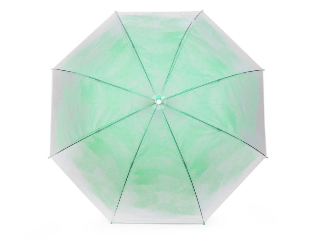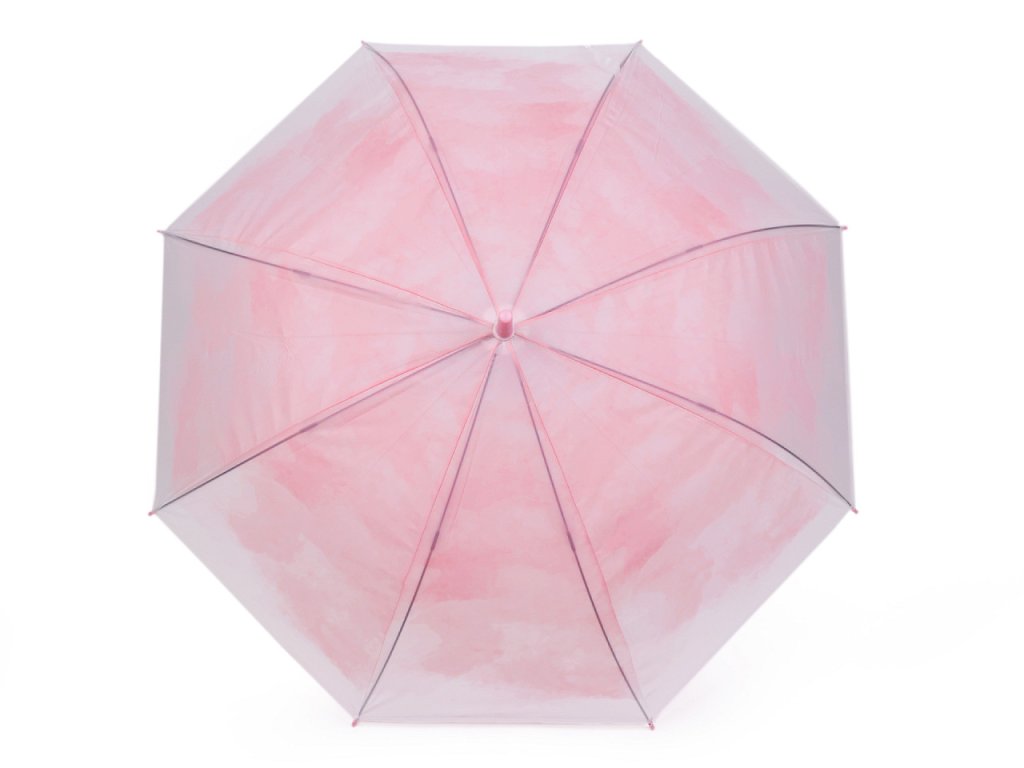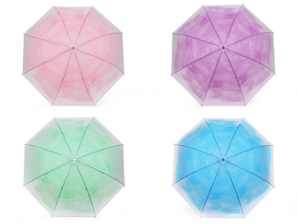 Průsvitný deštník s barevnými cákanci bude slušet dívkám i ženám. Deštník je vystřelovací, konstrukci má z kovového drátu a pružných lamel, tvoří osm polí.