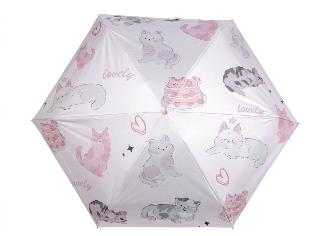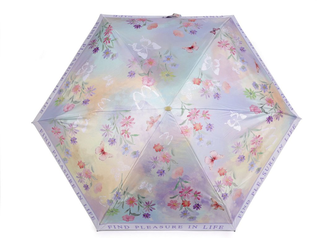 Skládací mini deštník má potah s barevným motivem. Díky malé velikosti je lehký a skladný, pohodlně se vám vejde do kabelky, po vložení do ochranného obalu má plochý tvar.