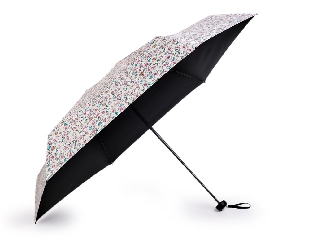 Skládací mini deštník má potah s motivem květů. Díky hliníkové konstrukci a malé velikosti je lehký a skladný, pohodlně se vám vejde do kabelky.