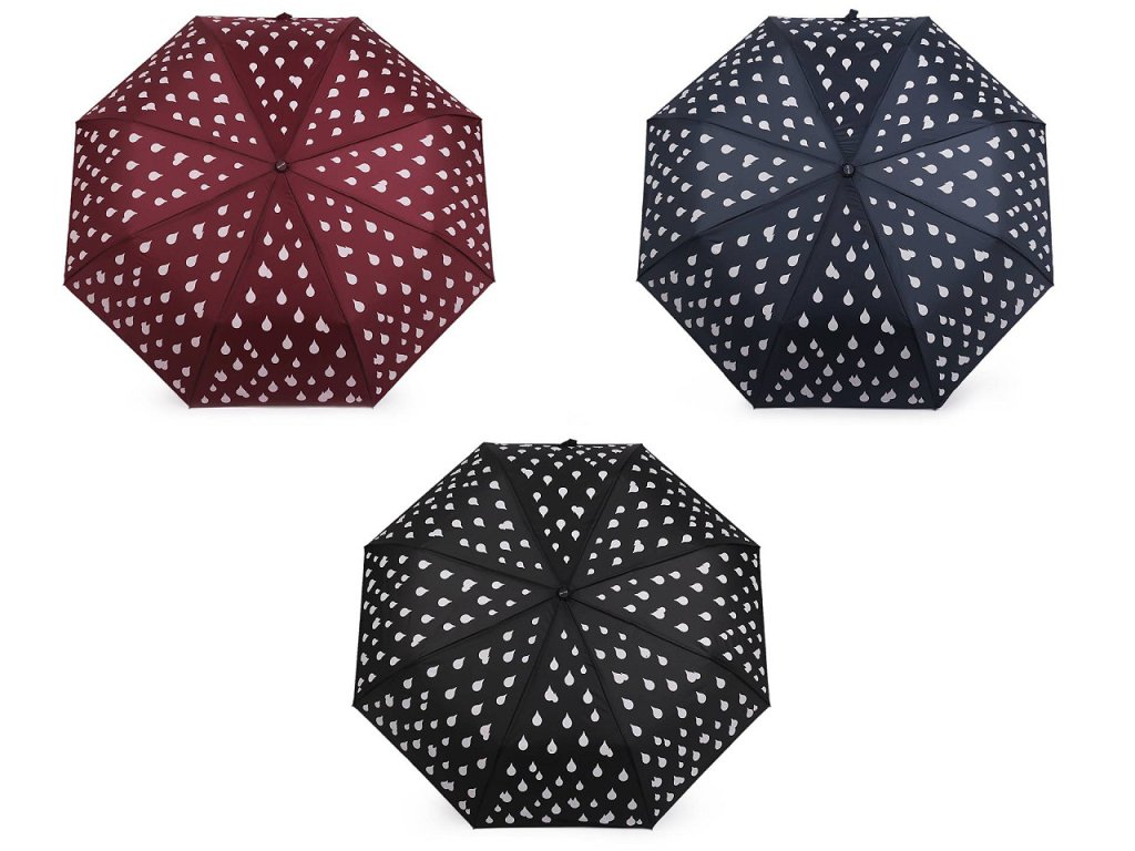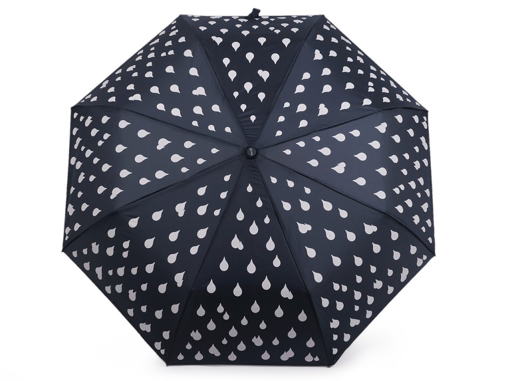 Kouzelný dámský skládací deštník mění barvy kapek při kontaktu s vodou. Doma se vám bude deštník jevit jako nenápadný, s bílými kapkami a jen co zaprší, kapky se nádherně vybarví. Deštník má vystřelovací mechanizmus - rozevře se stisknutím tlačítka, zavírá se manuálně.