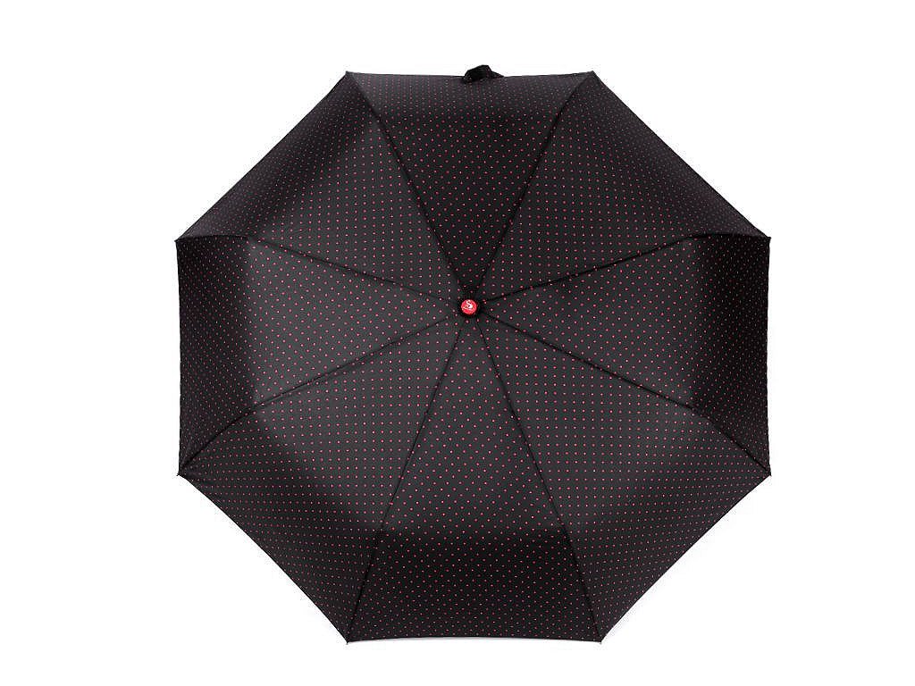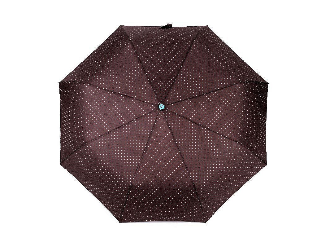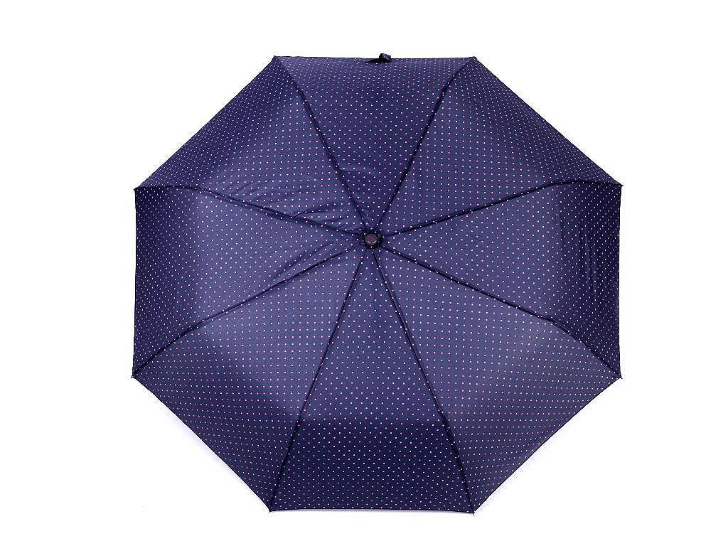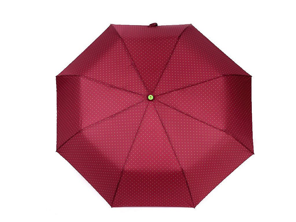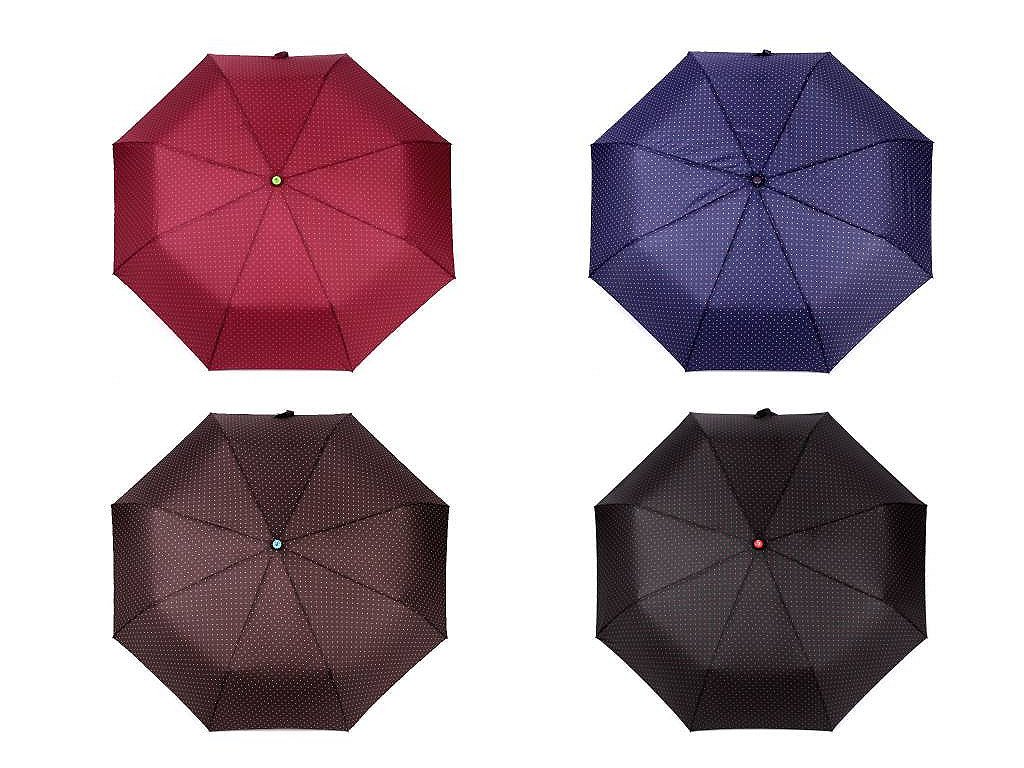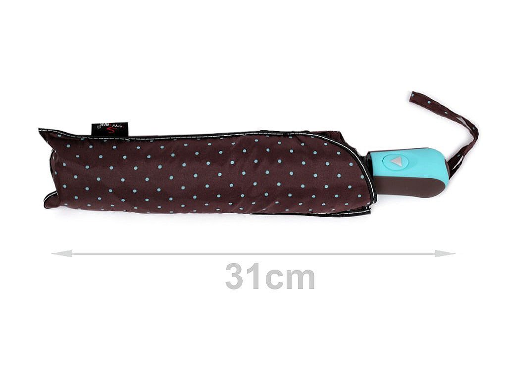Dámský skládací deštník zdobí drobné puntíky. Deštník má vystřelovací mechanizmus - rozevře se stisknutím tlačítka, zavírá se manuálně. Konstrukce je tvořena osmi poli.