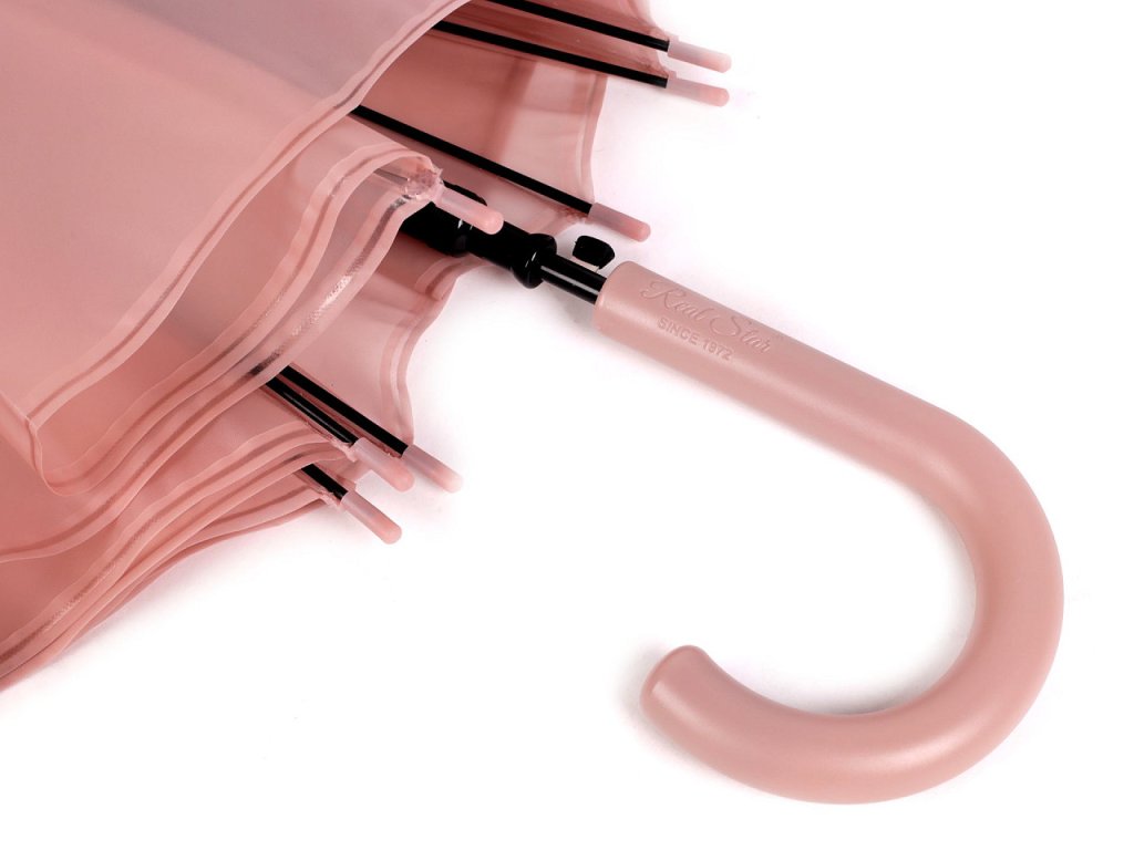 Průsvitný deštník je vystřelovací, konstrukci má z kovového drátu a pružných lamel, tvoří osm polí.