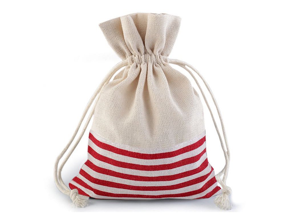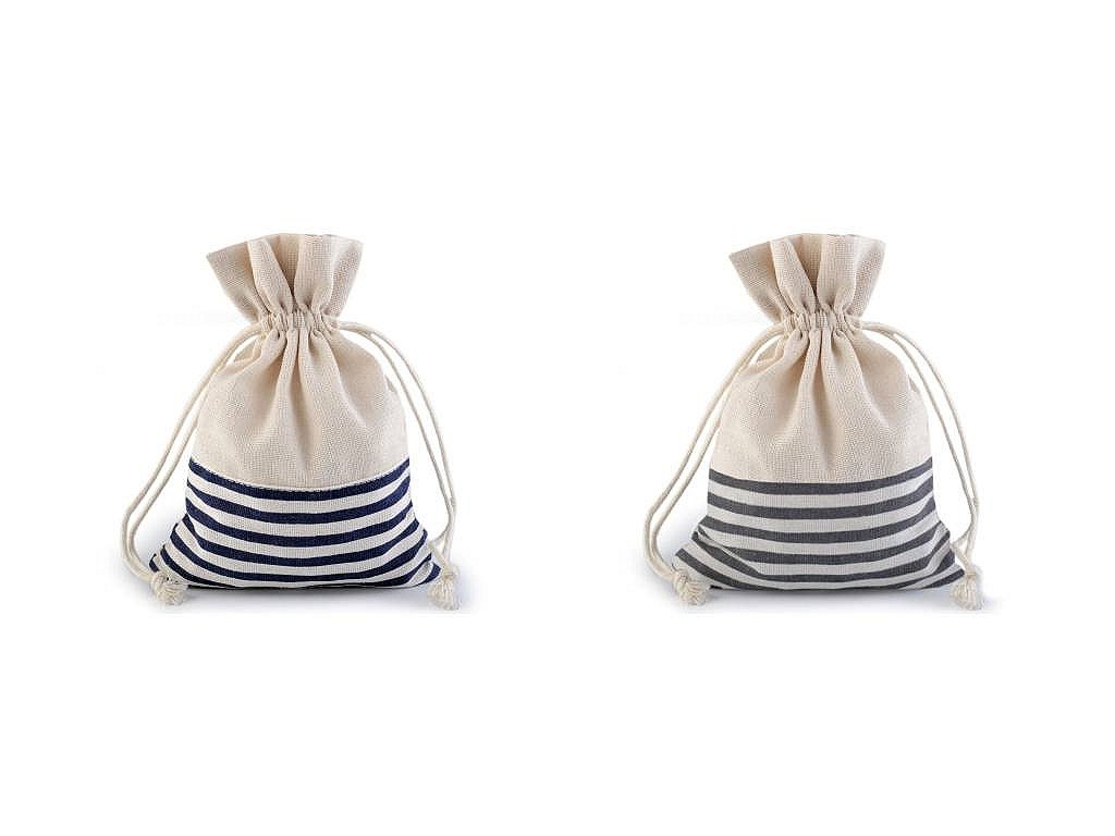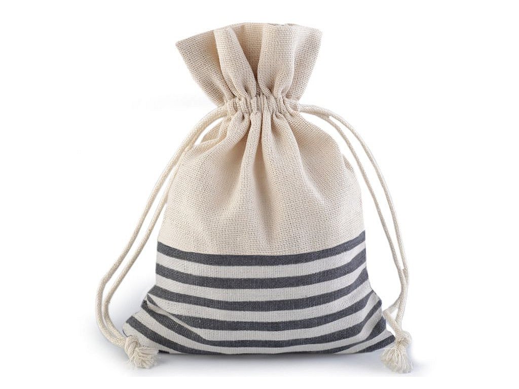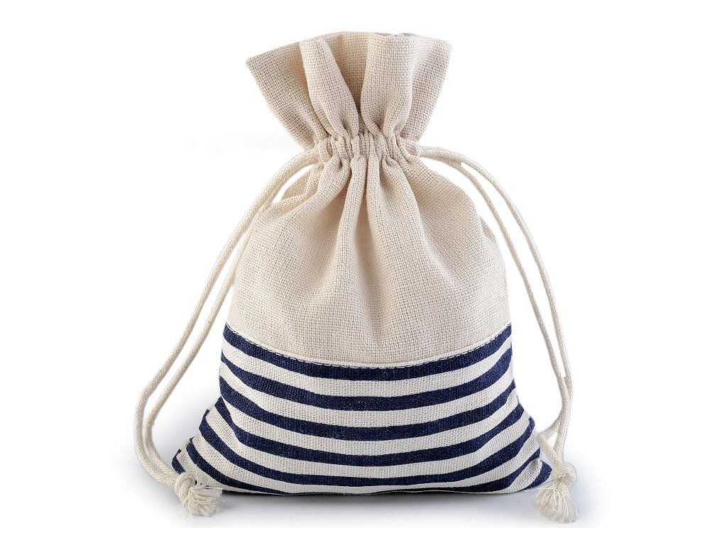 Lněný pytlík v námořnickém stylu zdobí vodorovné proužky. Uzavírá se pomocí dvou stahovacích šňůrek.