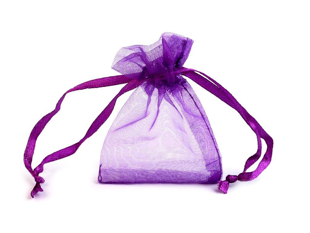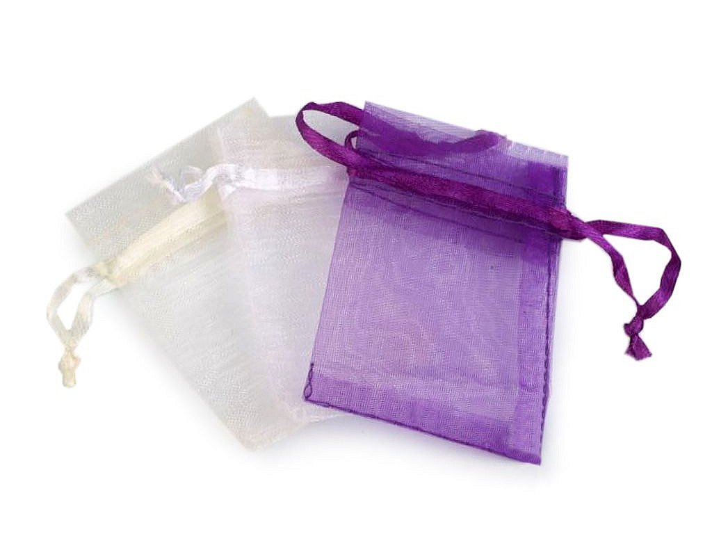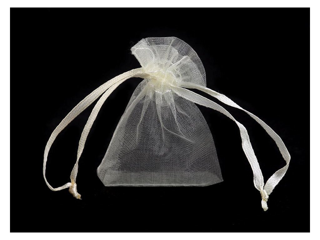 Je vyrobený z jemně lesklé organzy. Snadno se uzavírá pomocí dvou stahovacích saténových šňůrek.
