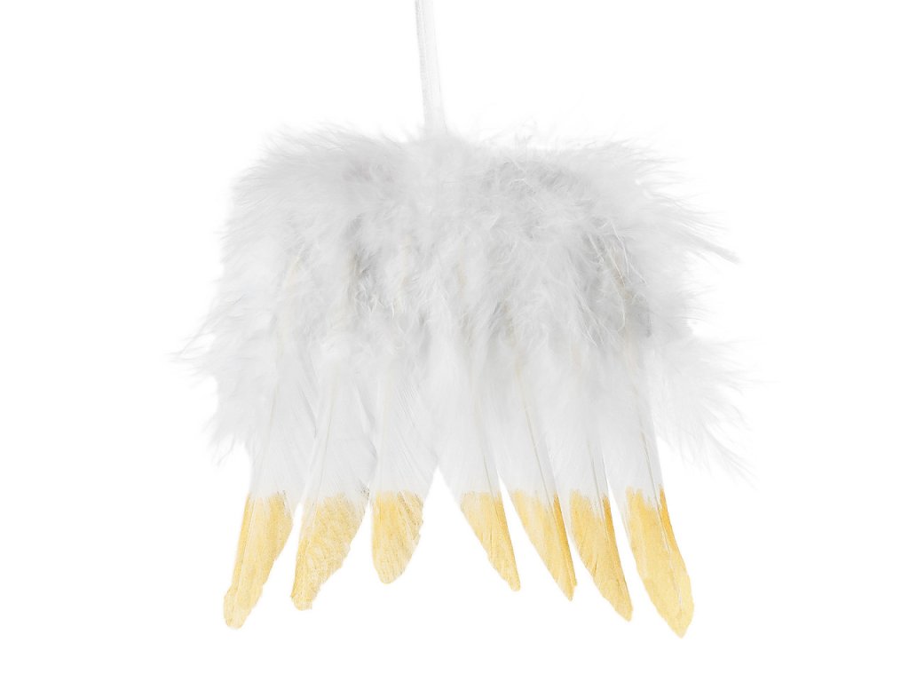 Dekorace andělských křídel je vyrobena z peří, které je nalepené na tvrdém papíru.