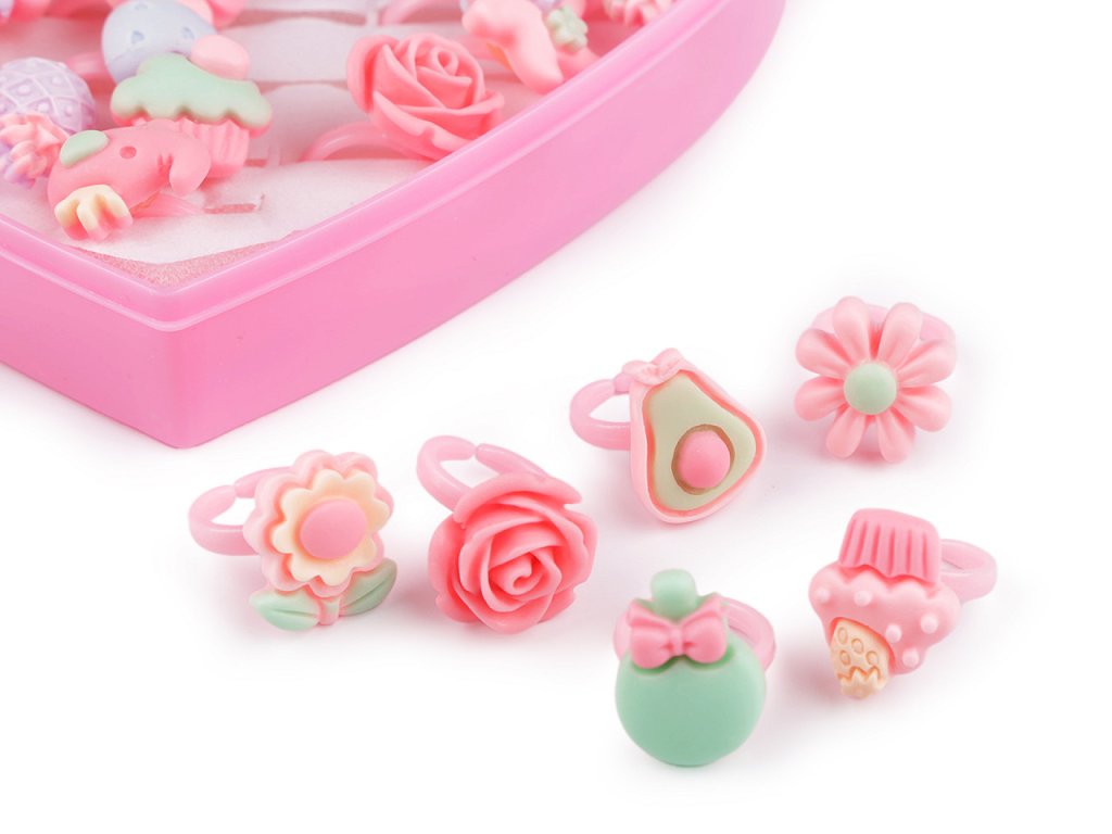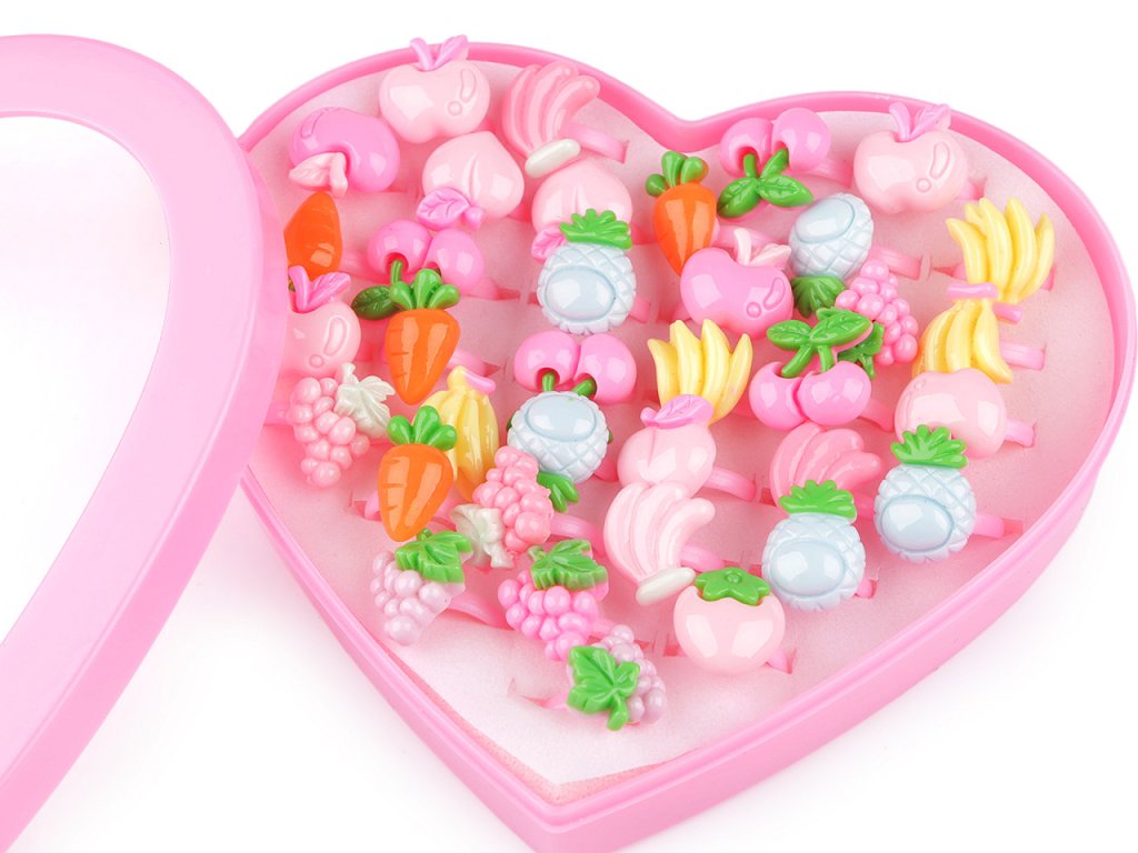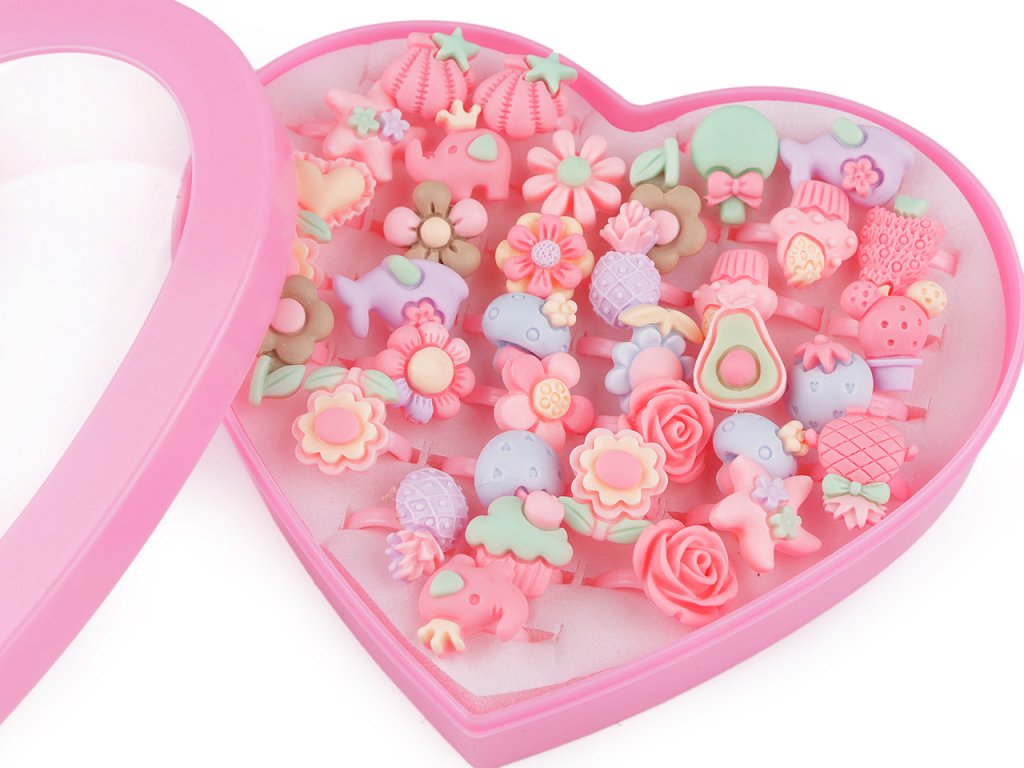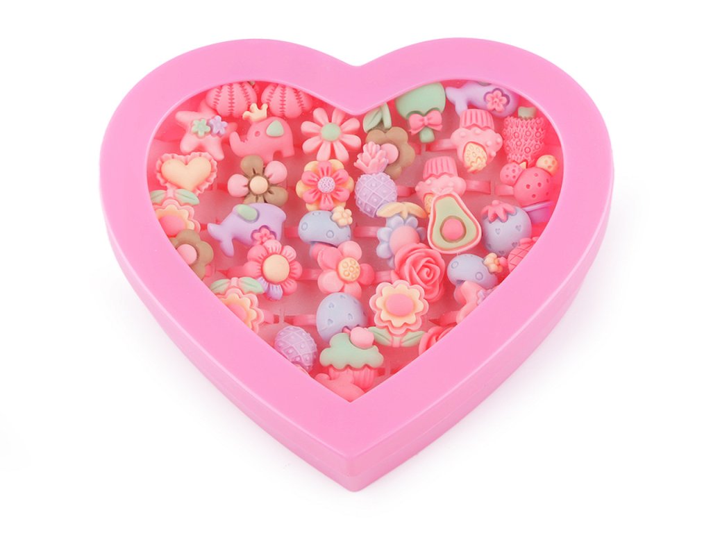 Mix dětských prstýnků je zabalený v plastové srdcové kazetě, která má průhledné plastové víko.