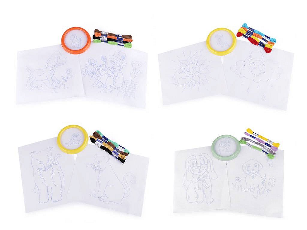 Zabavte vaše šikovné děti vyšíváním. Souprava dětského vyšívání obsahuje kulatý rámeček s látkou, která má předtištěný vzor, 4 kvalitní vyšívací příze mouline ze 100% bavlny a dvě větší plátna (23 x 26 cm) s předtištěnými motivy.