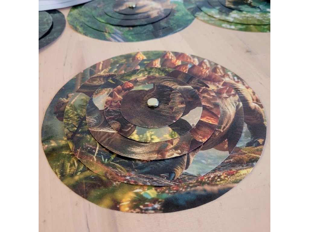 Každý z obrázků se skládá z pěti kruhů, které se dají otáčet. Hotový výrobek se spojuje vzorovou sponou (puklicí) a vytvoří interaktivní otočnou skládačku. Úkolem dětí je správně otáčet kotouči tak, aby složily obrázek jako puzzle.
