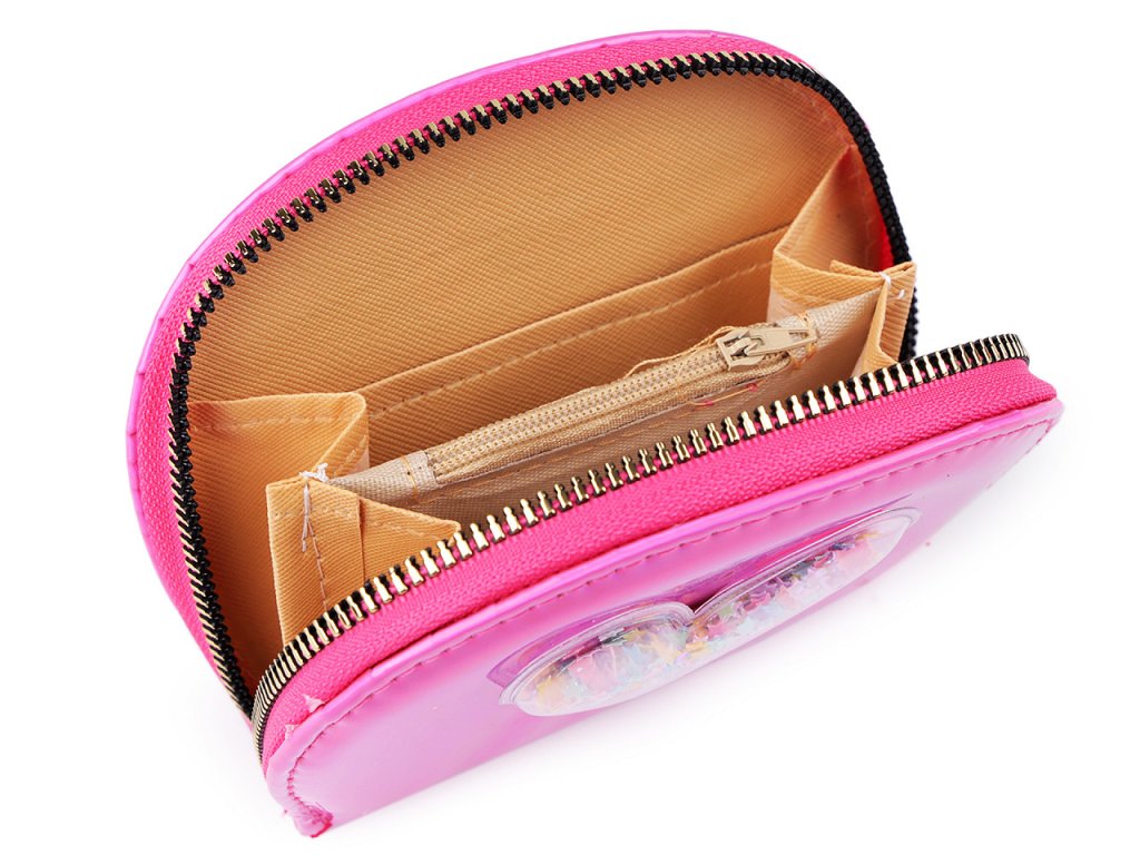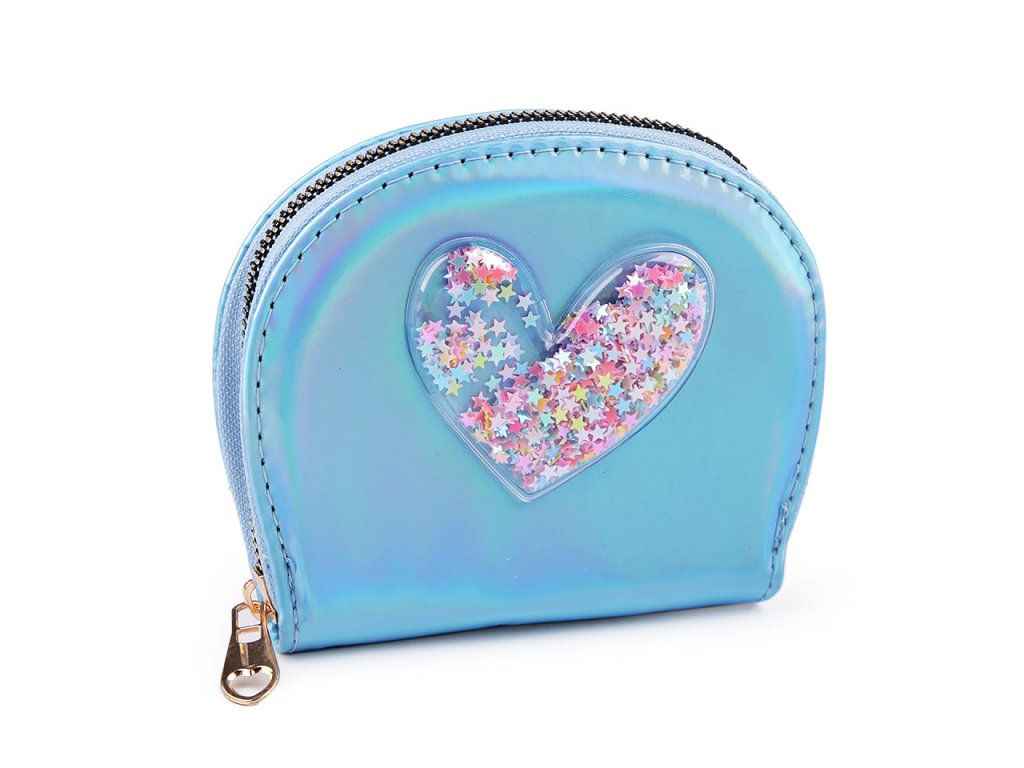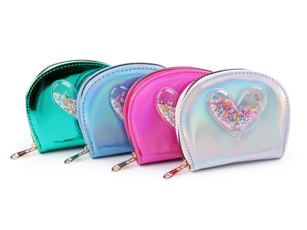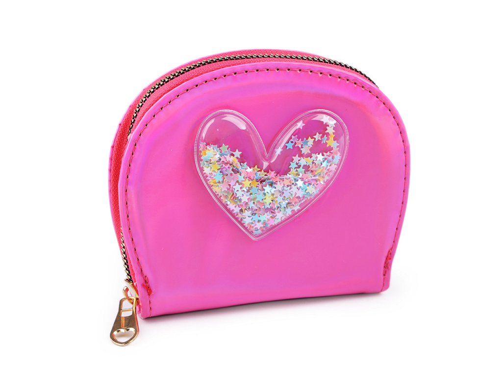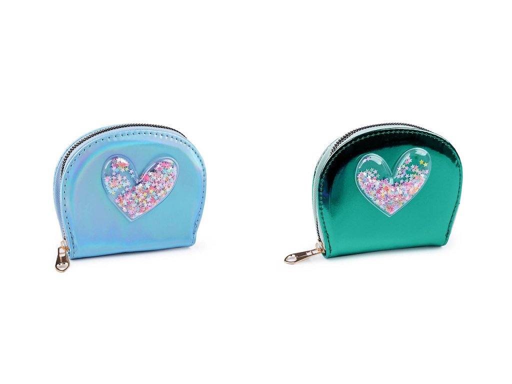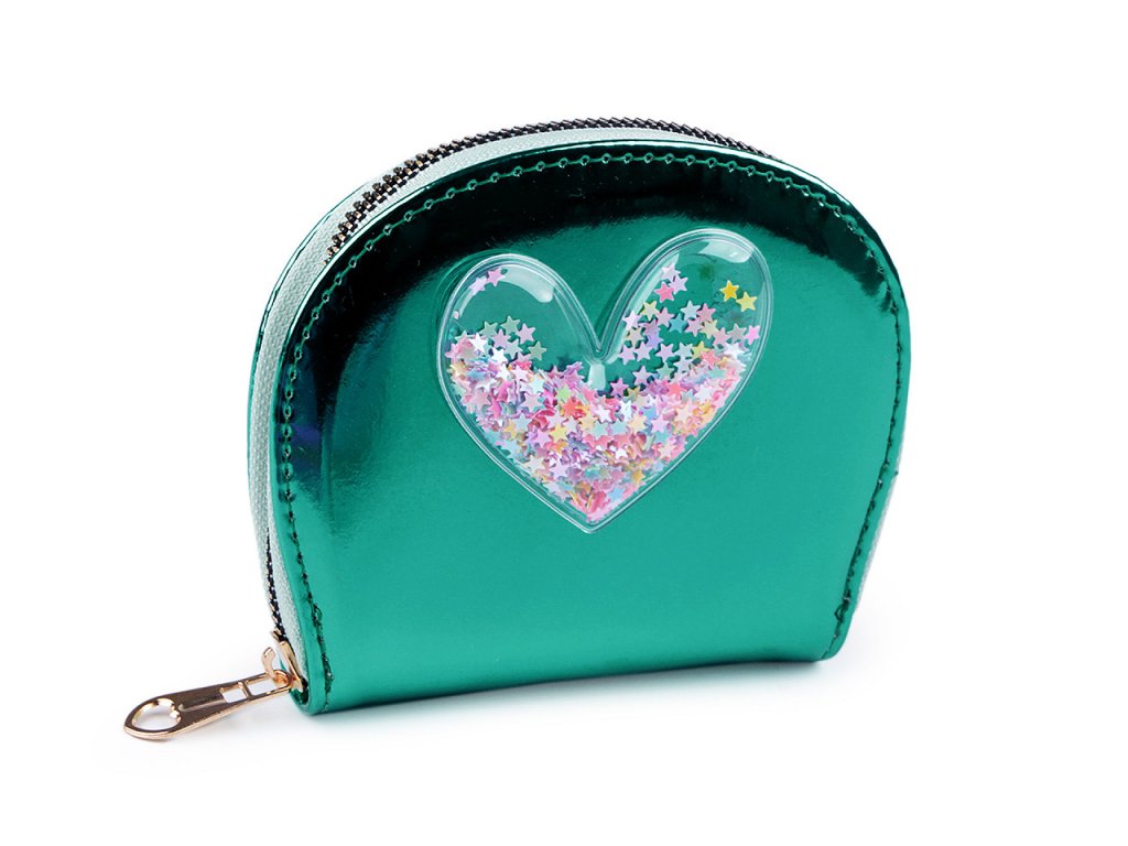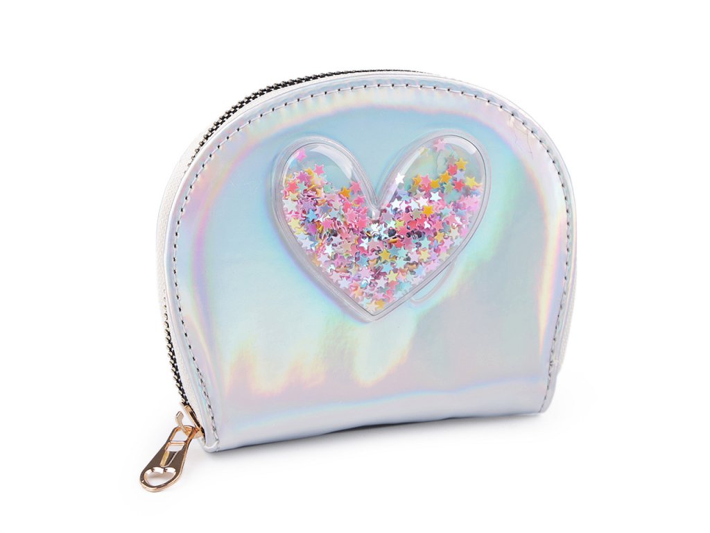 Malá šikovná peněženka se vejde do každé kabelky. Má poutavý metalický lesk, přední stranu má ozdobenou aplikací srdce s přesýpacími flitry.