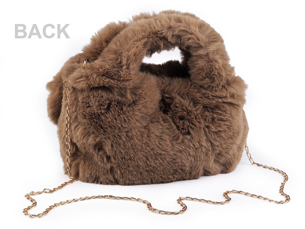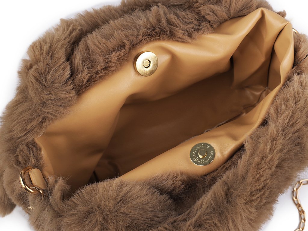 Má chlupatá ucha do ruky a kovový odnímatelný řetízek na karabiny na nošení přes rameno.
