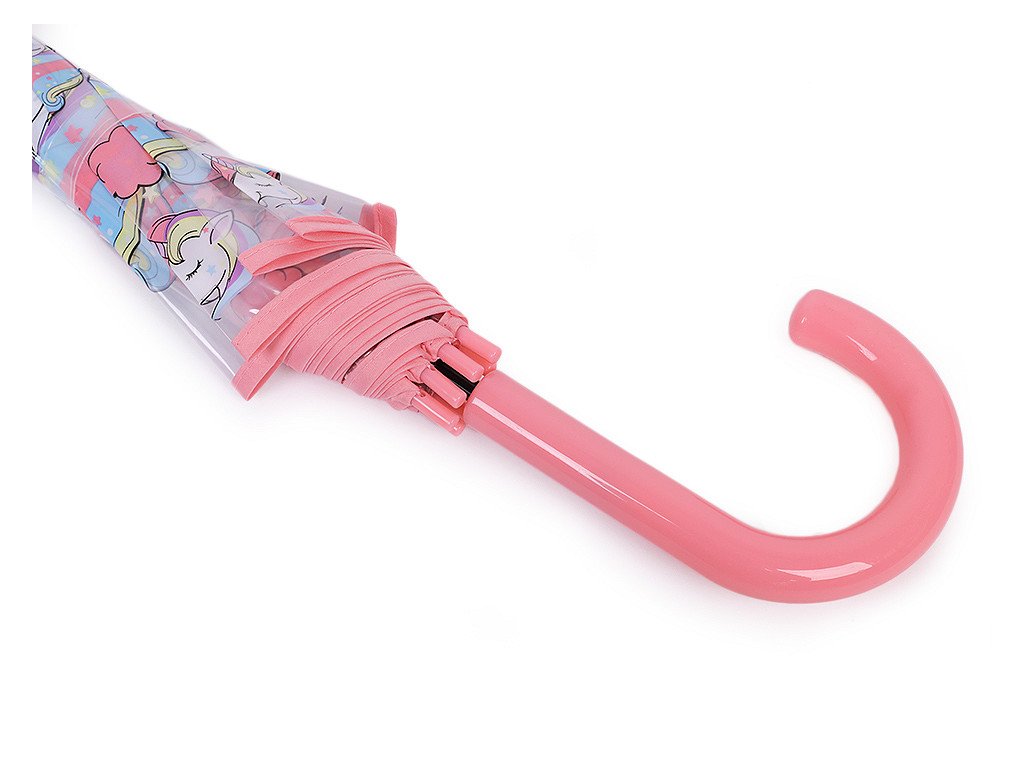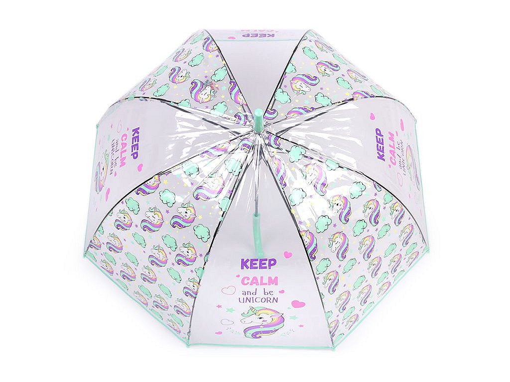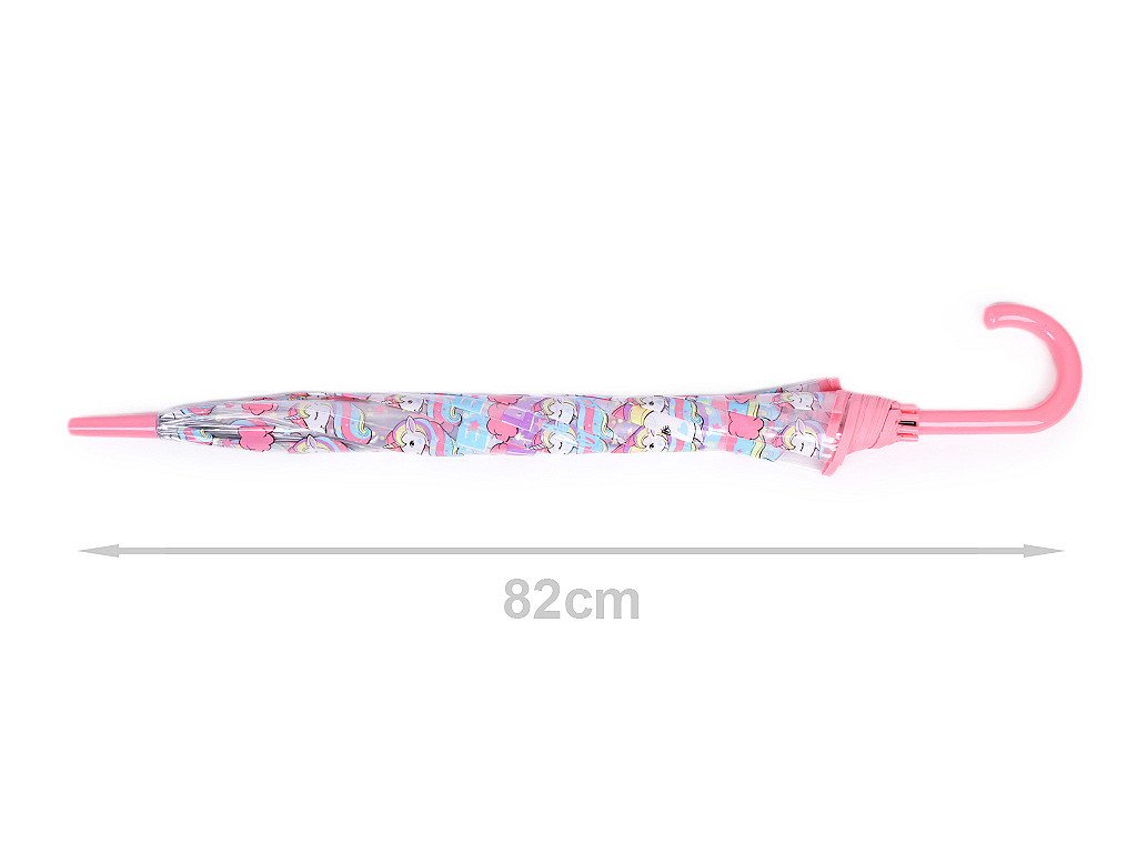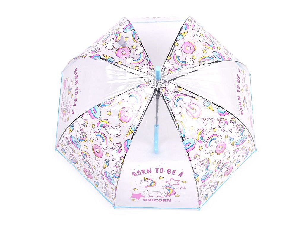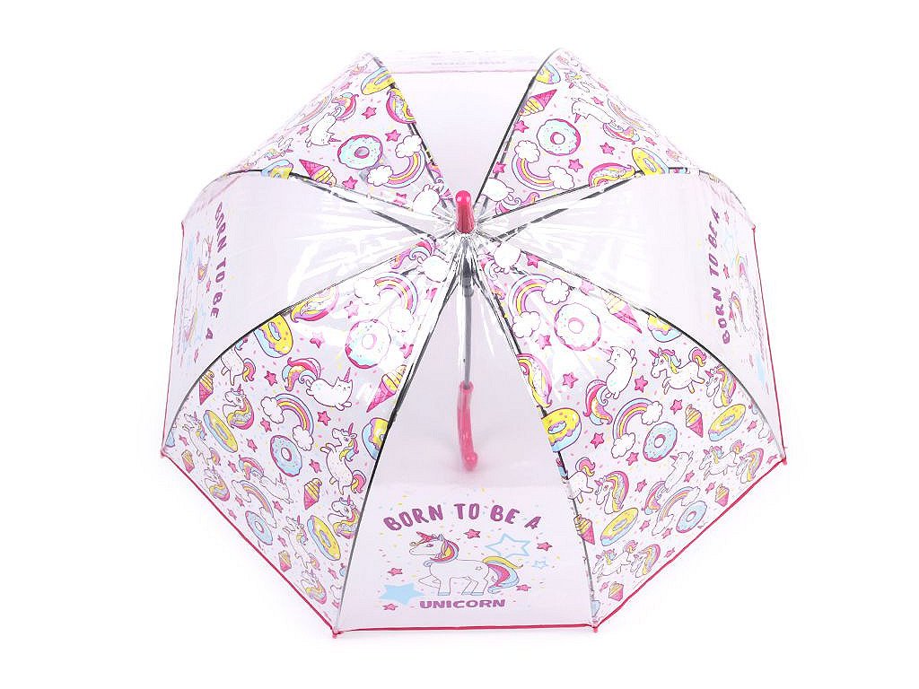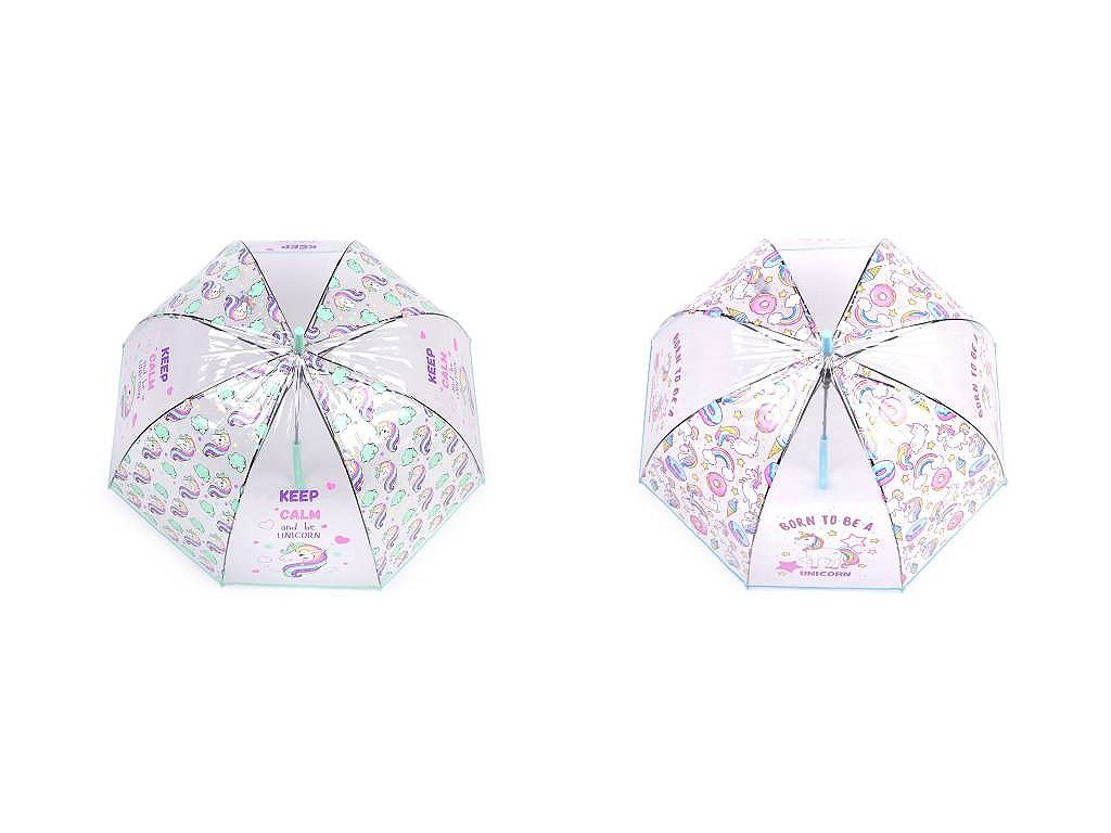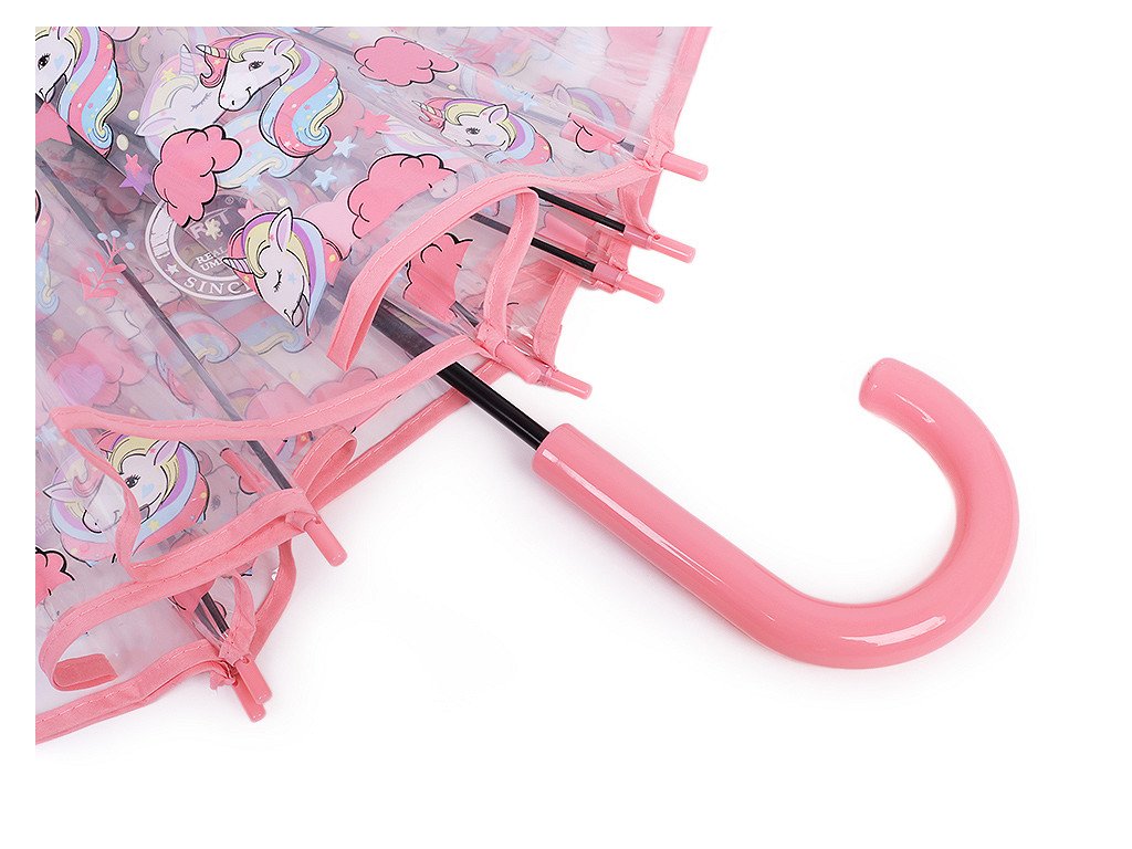 Pevný průhledný potah deštníku s milým potiskem trendy jednorožců je doslova uchvátí. Průhledný design umožňuje lepší výhled, bez omezující clony deštníku.