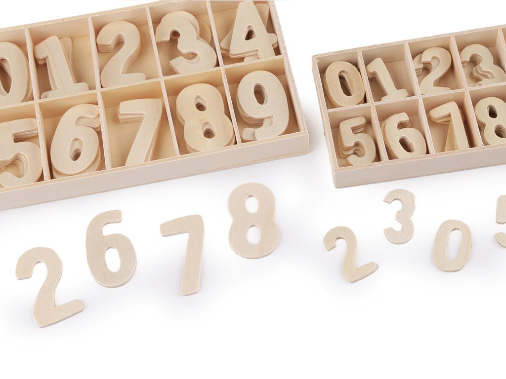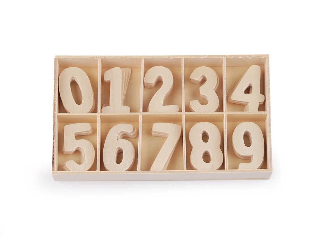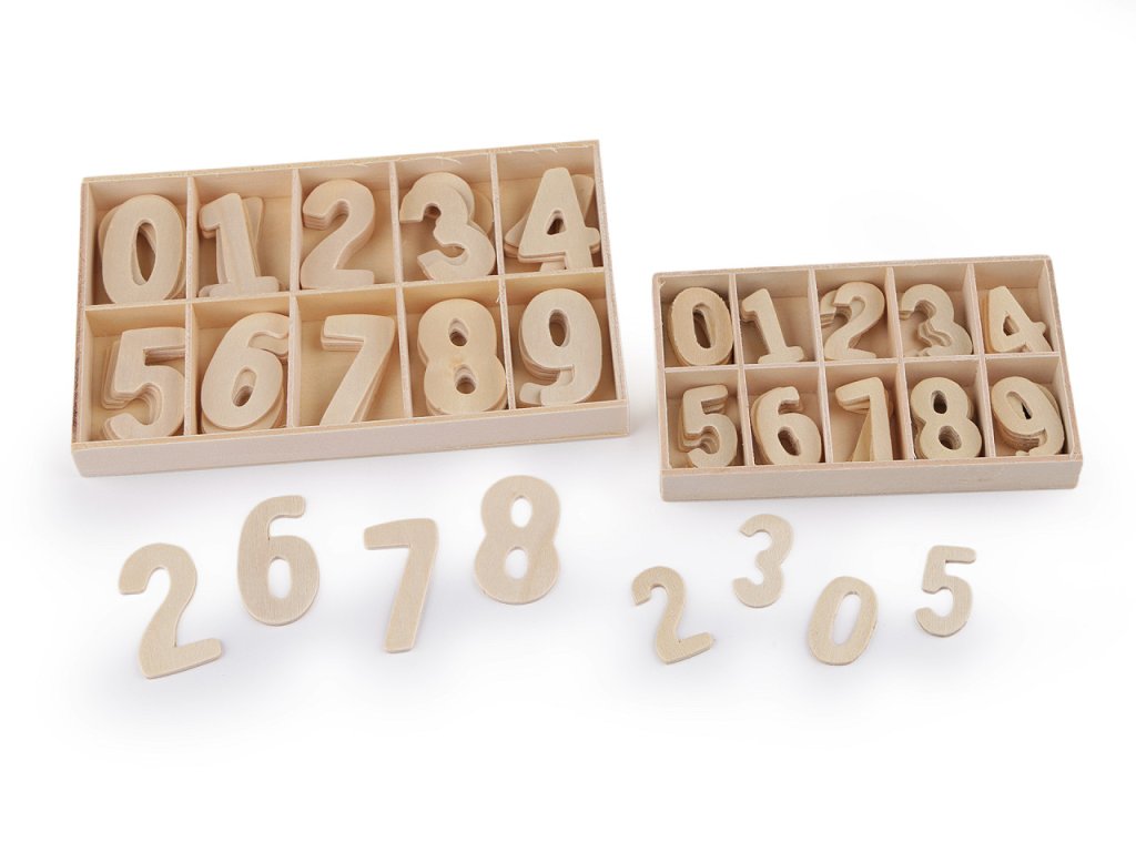 Tloušťka číslic je 1,5 mm. Tloušťka překližky na krabici je 2,5 mm. V sadě najdete čísla od 0 po 9, každé z nich po 5 ks.