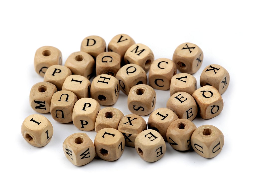 Dřevěné korálky kostky s potiskem písmenek. Písmena jsou na všech ploškách, chybí pouze na stranách s průvleky.