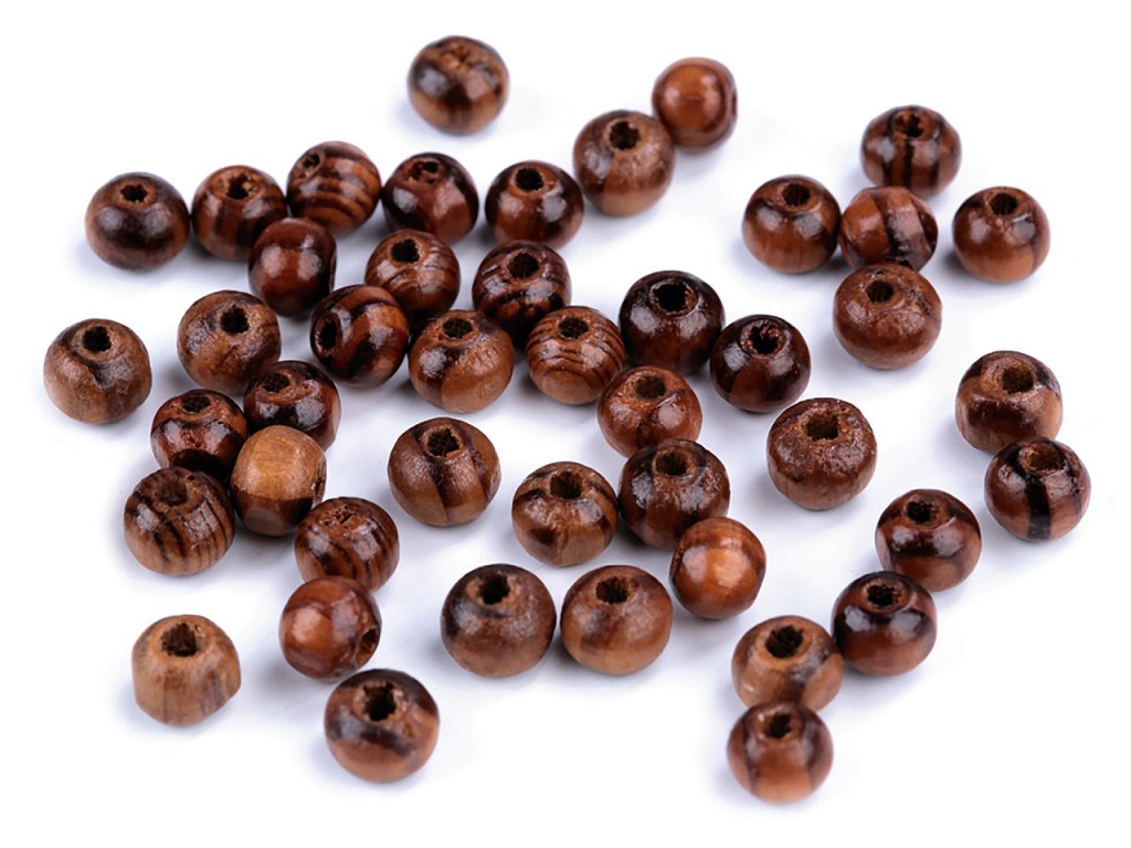 Malé dřevěné korálky s výraznou kresbou dřeva jsou lakované.