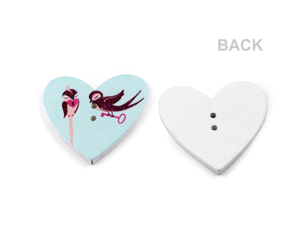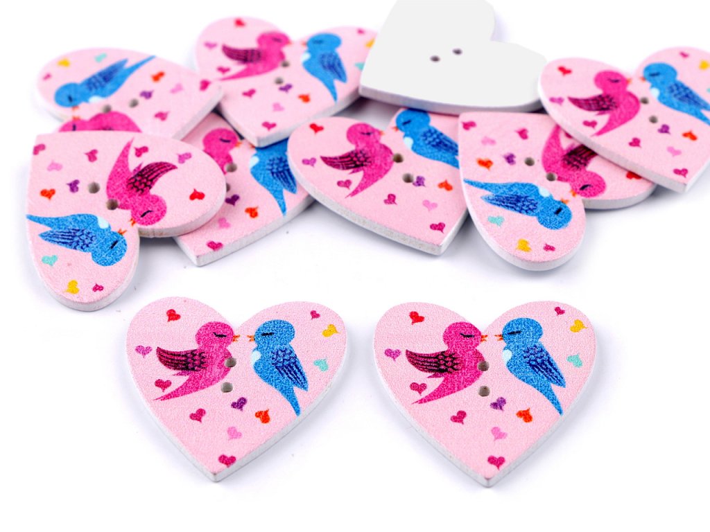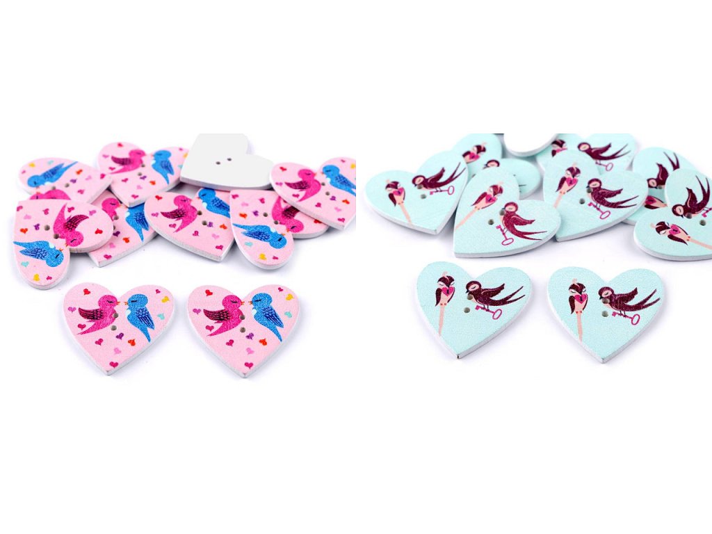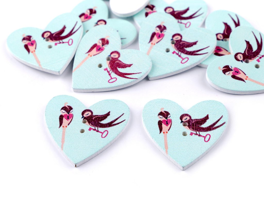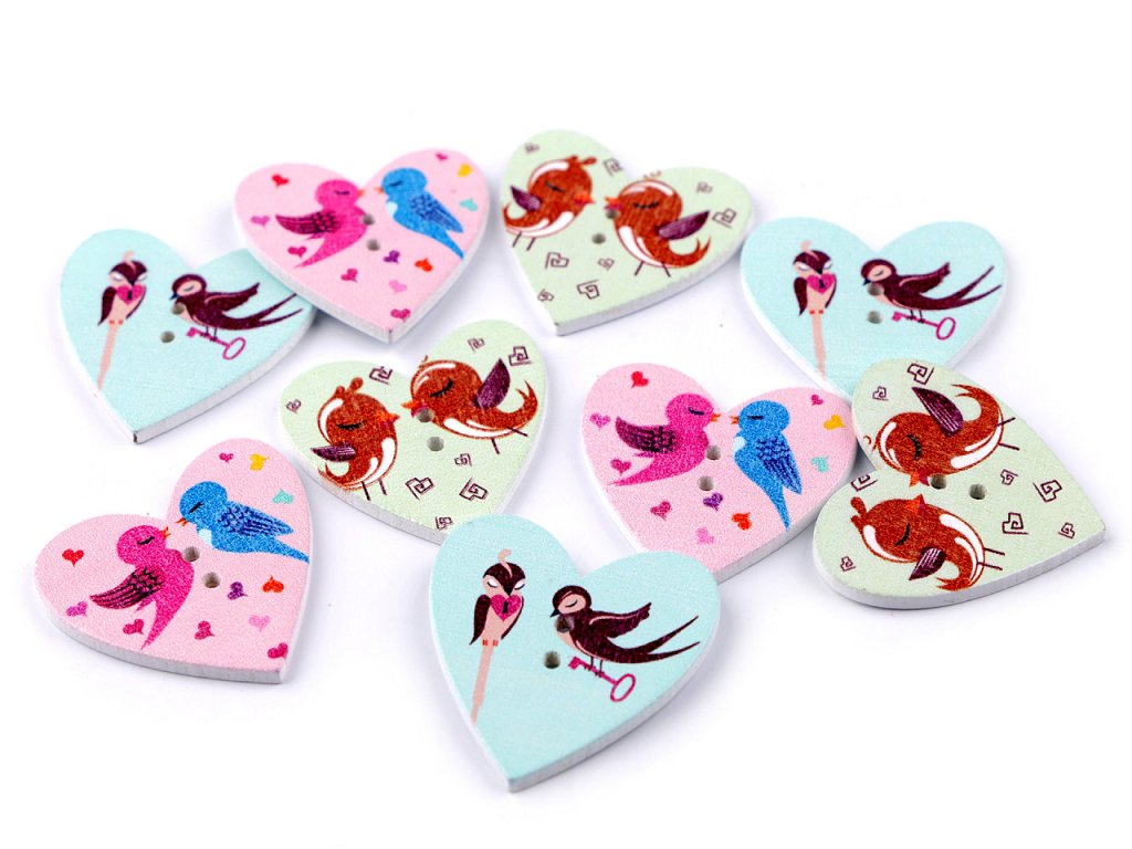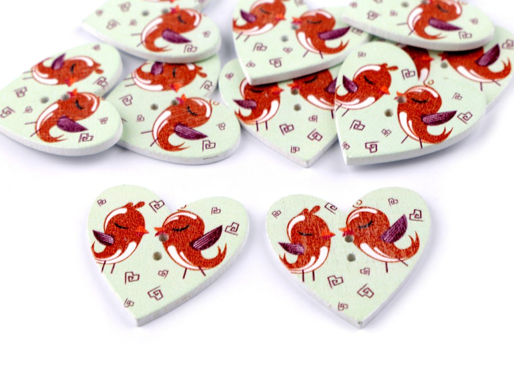 Dřevěné dekorační knoflíky s párem ptáčků jsou vhodné ke zdobení alb, přáníček, krabiček, rámečků, květináčů, k balení dárků i k netradičnímu svatebnímu aranžování.