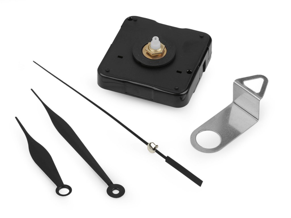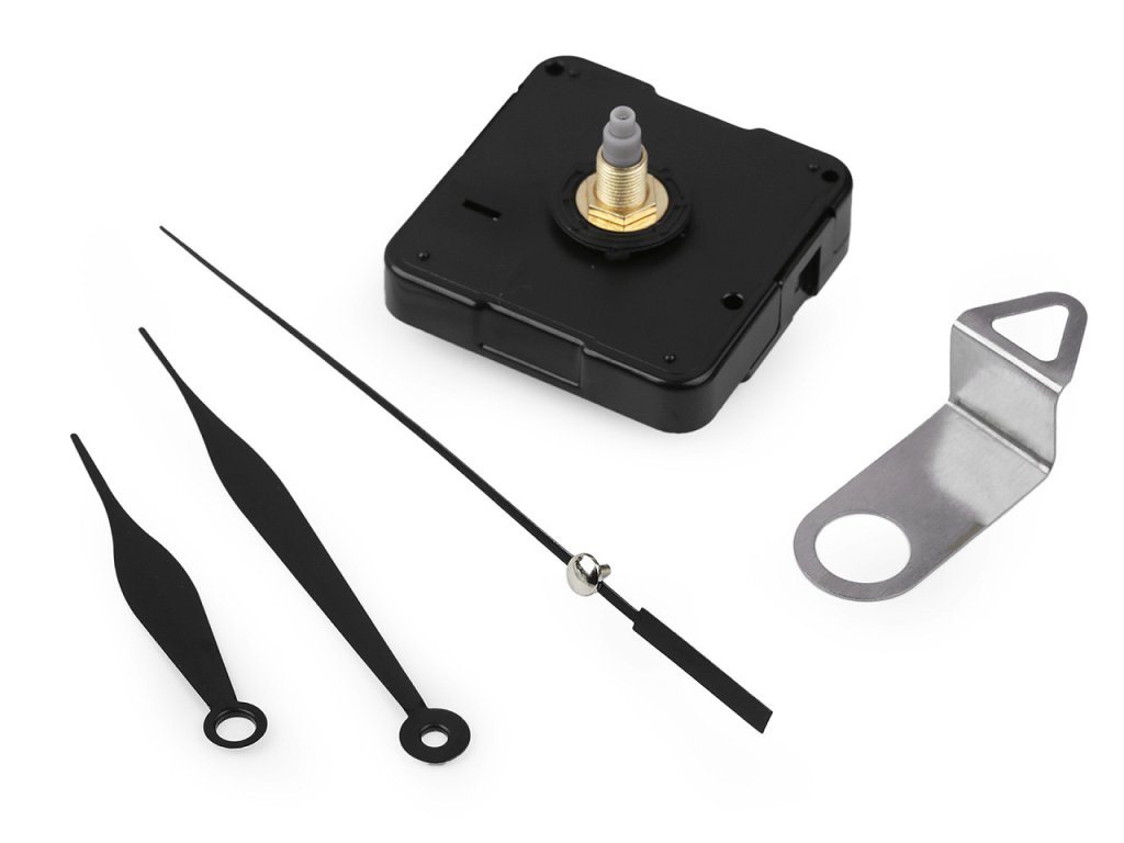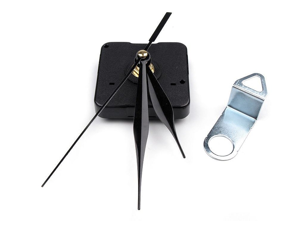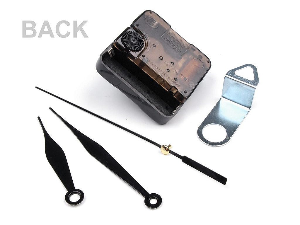 Set obsahuje: 3 hodinové ručičky (130 mm, 96 mm, 67 mm), strojek, šroubek s matičkou a dvěma podložkami a závěs. Strojek má rozměry 55 x 55 mm, jeho tloušťka je 15 mm. Matičkou lze upnout materiál o max. tloušťce 9 mm. Samotná délka šroubovací osičky je 12 mm, průměr 7,5 mm. Celou délku osičky můžete využít, pokud strojek zezadu k hodinové desce přilepíte ( nebudete šroubovat matičkou ).
