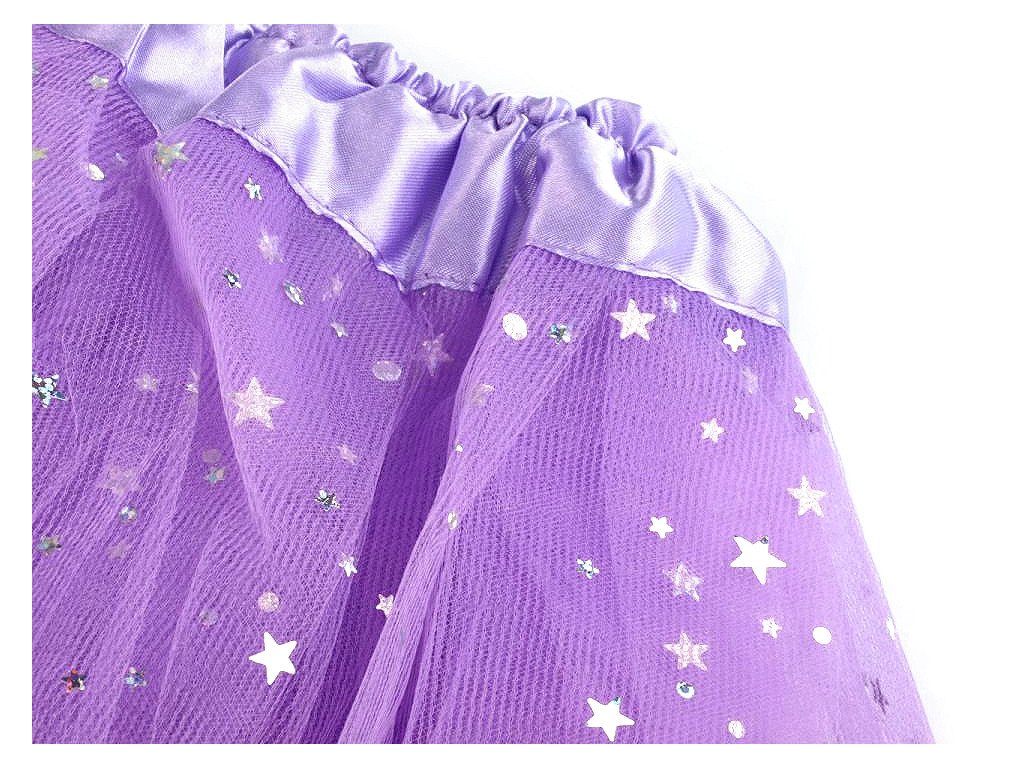 Horní vrstva je bohatě pokrytá třpytivými flitry. Sukně má v pase gumičku, aby se mohla dobře přizpůsobit své nositelce.