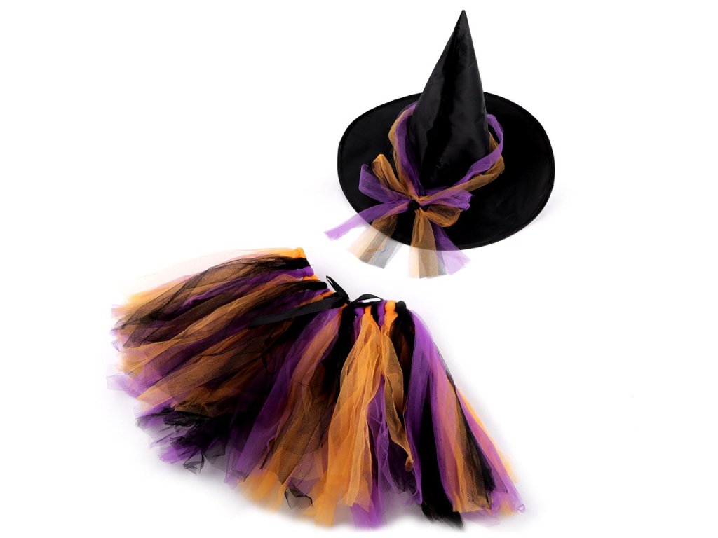 Dětský čarodějnický karnevalový kostým se skládá z klobouku a tylové sukně. Klobouk dobře drží tvar a je ozdobený tylem.