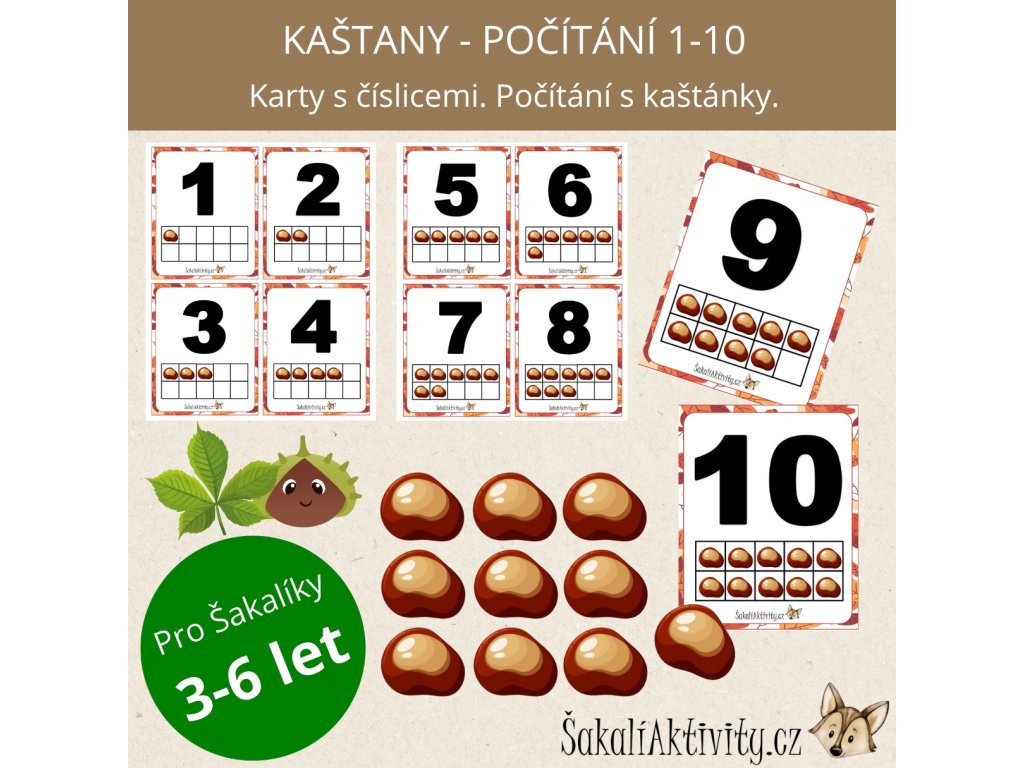 Zařazení této aktivity: počítání s kaštany, čísla do 10 děti, pracovní listy číslice, kaštany pro děti, předmatematické dovednosti, aktivity s kaštany, čísla pro předškoláky, pracovní listy počty, kaštánková aktivita, grafické znázornění počtu, kaštany ke stažení, Šakalí aktivity
