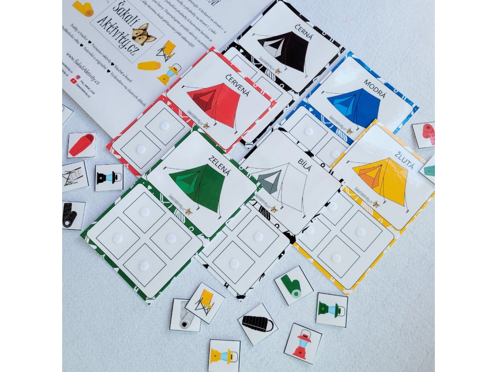 Sada obsahuje 6 předlohových karek k doplnění s barevnými pigmenty a sadu 24 obrázků s předměty z prostředí kempu. Dítě předměty třídí podle barem a přikládá je na předlohových karet podle toho jaká barva na předmětu převažuje. Užijte si léto v rytmu kemopování!