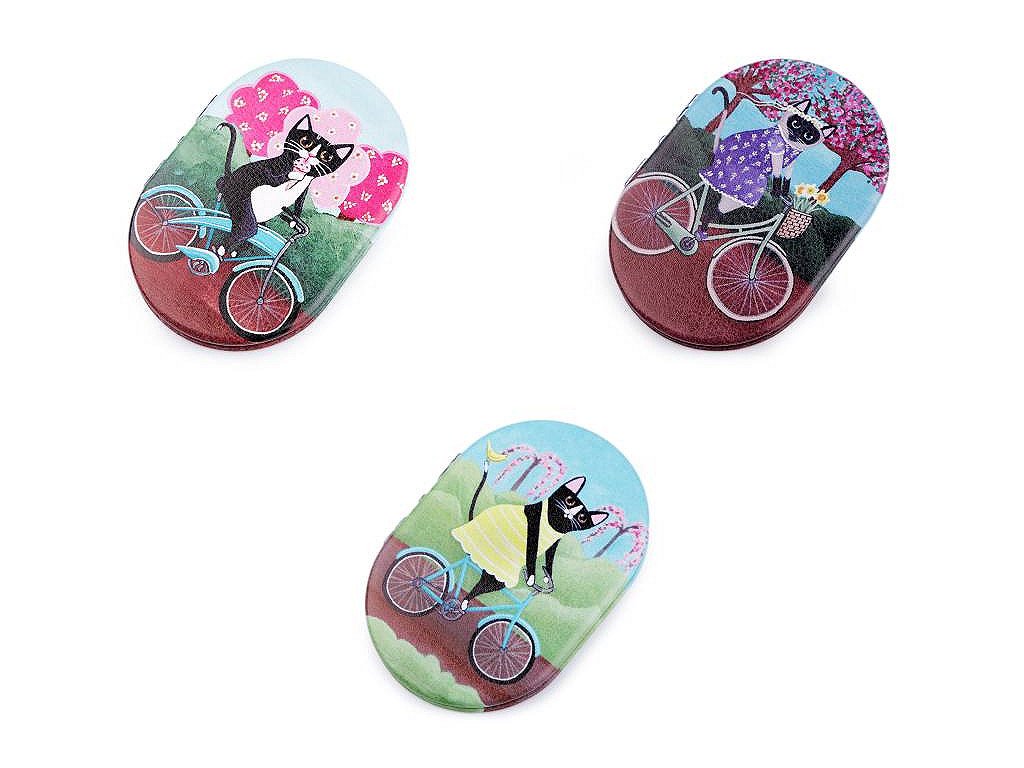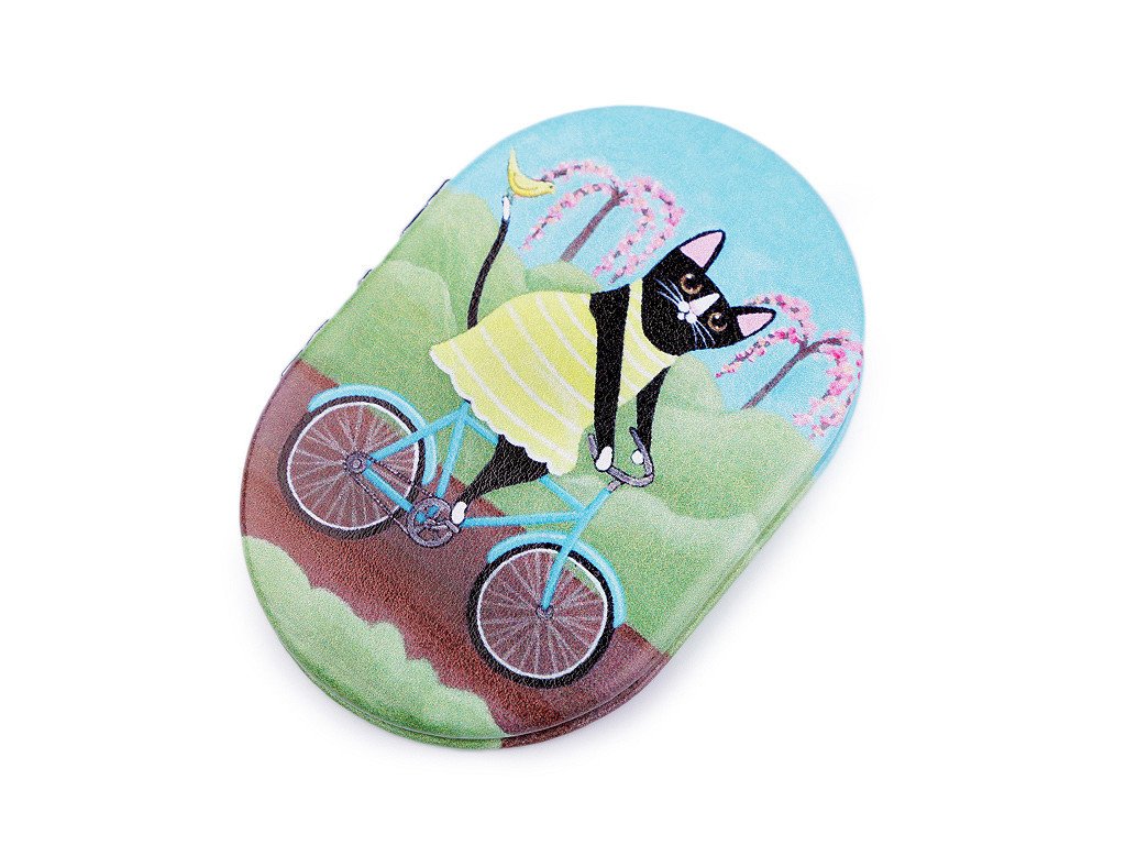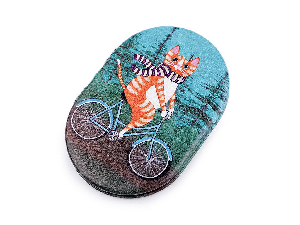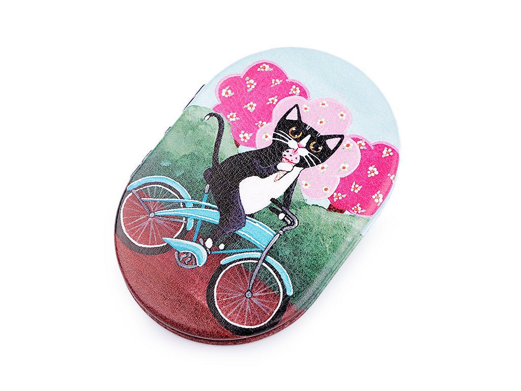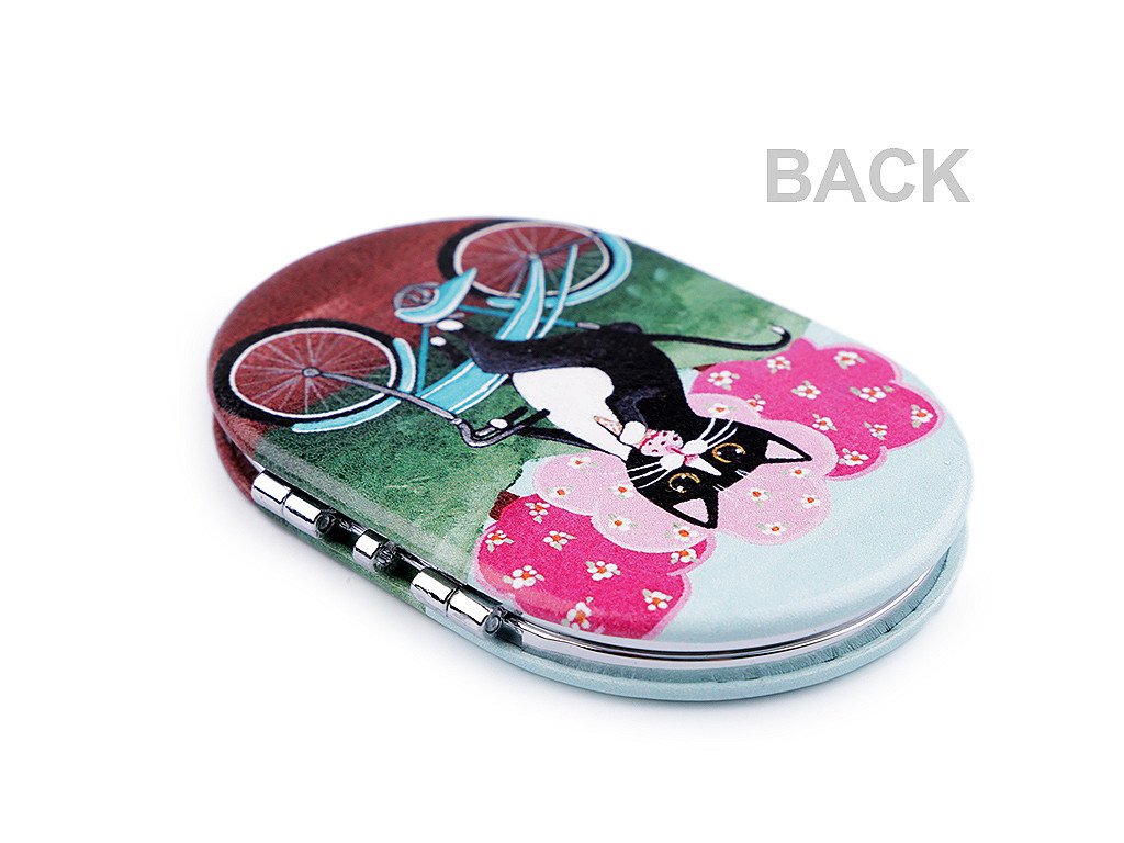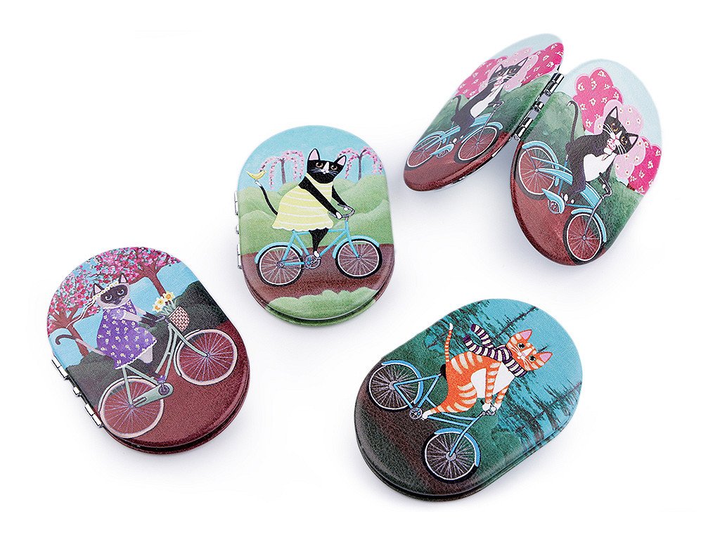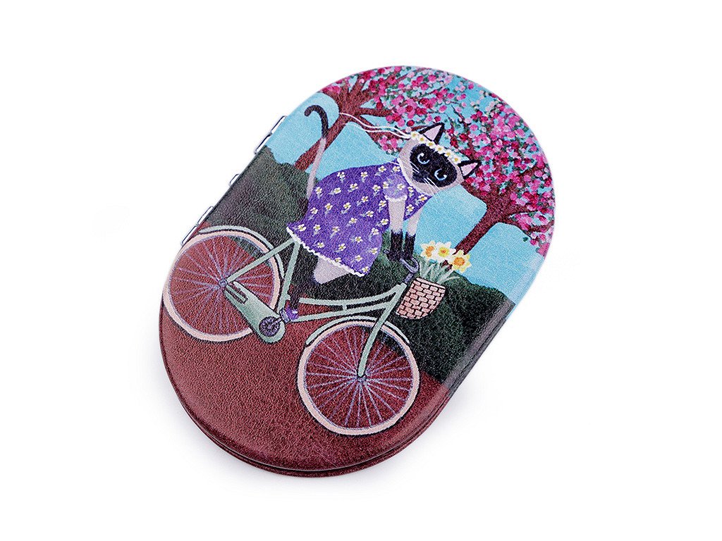 Otevírací zrcátko s potiskem kočky na bicyklu se hodí pro opravu make-upu kdykoliv během dne.