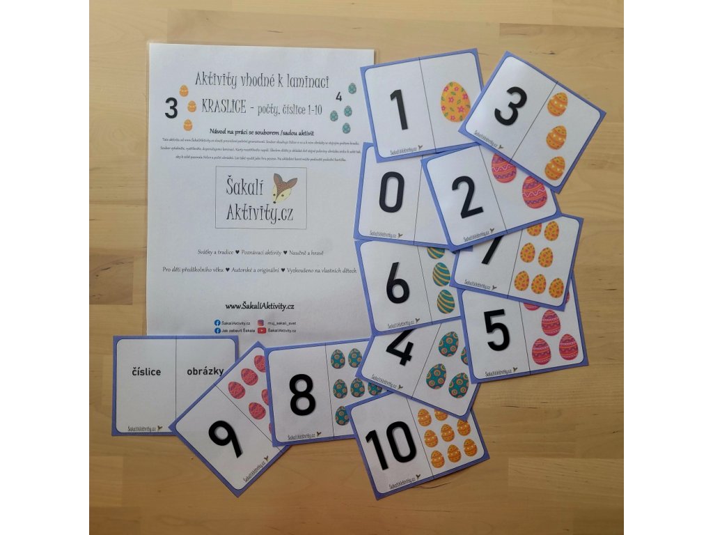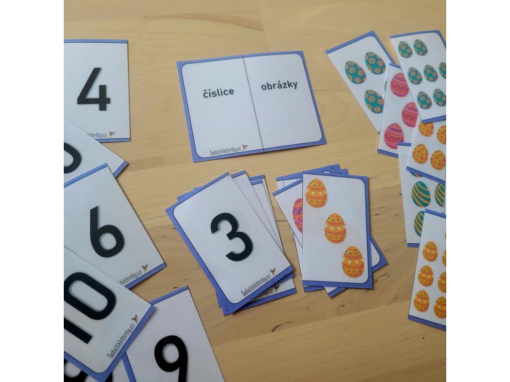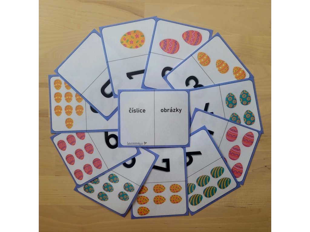 Hravá Velikonoční vejce. Aktivita s kraslicemi. Každá karta velikosti A5 je složena ze dvou čátstí - číslice a počtem kraslic. Karty zalaminujte a rozstřihněte. Úkolem dítěte je v této aktivitě spojovat dvojce, které k sobě patří (číslice + obrázek). Lze využít také k přikládání knoflíků s velikonočními motivy, nebo zmenšenin vajíček. Dítě tak snadno a zábavně procvičí početní představivost do deseti.