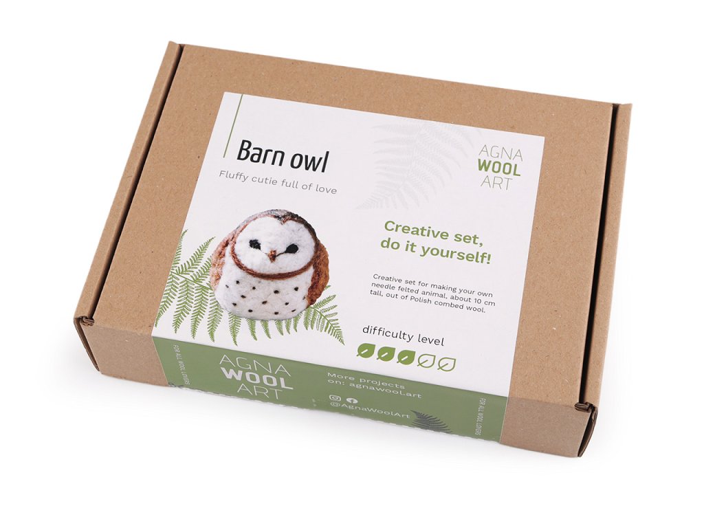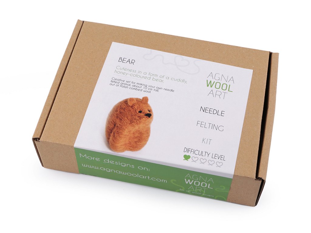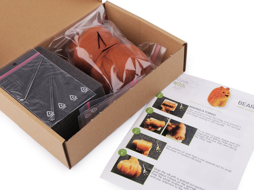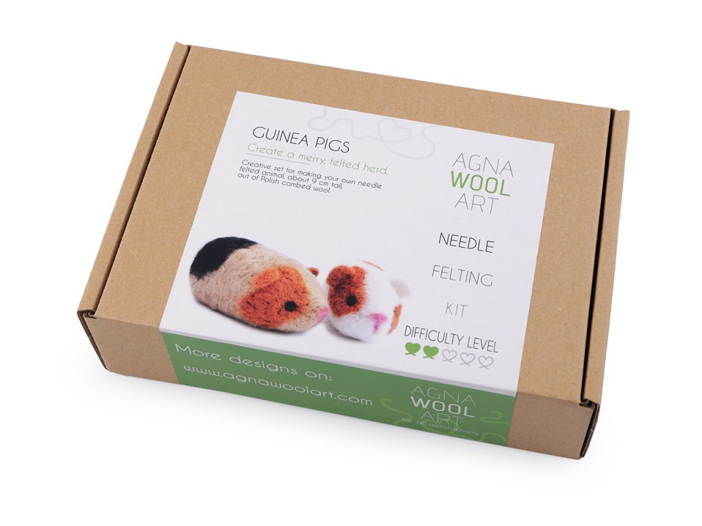 V sadě najdete: hebké česance 100% vlny, anglický návod k použití s podrobnými fotografiemi, jak plstěné zvířátko vyrobit, 3 jehly na plstění, podložku na plstění a 2 černé korálky. V