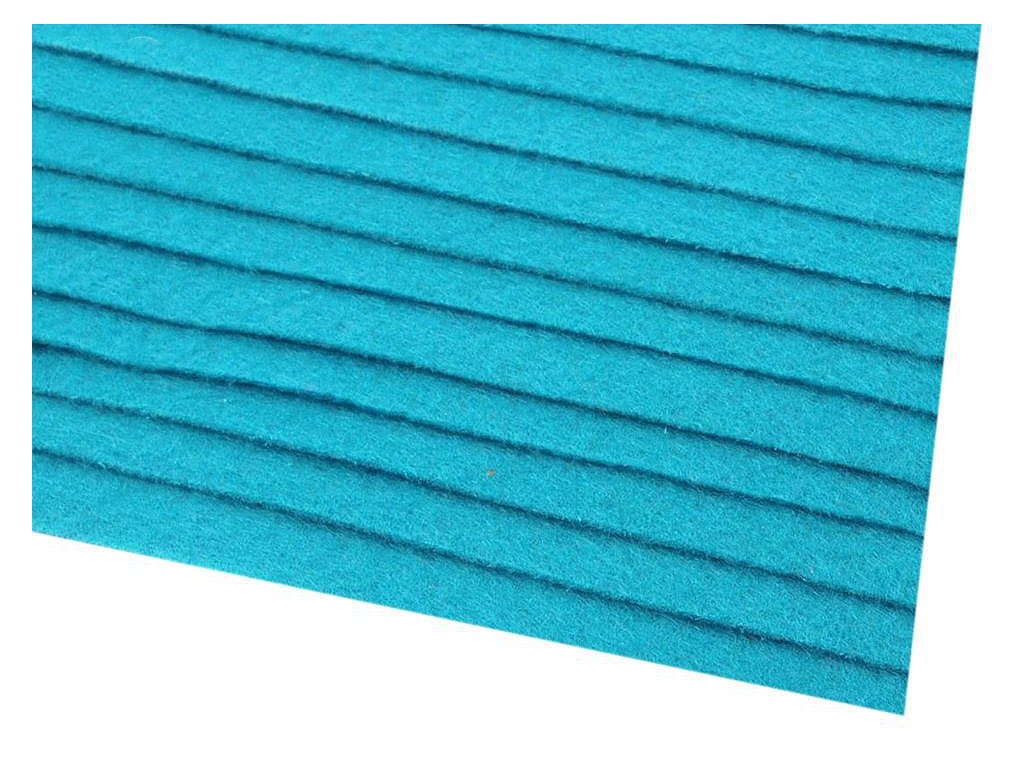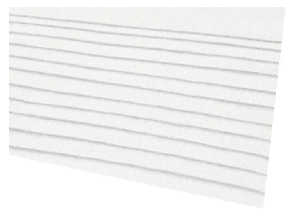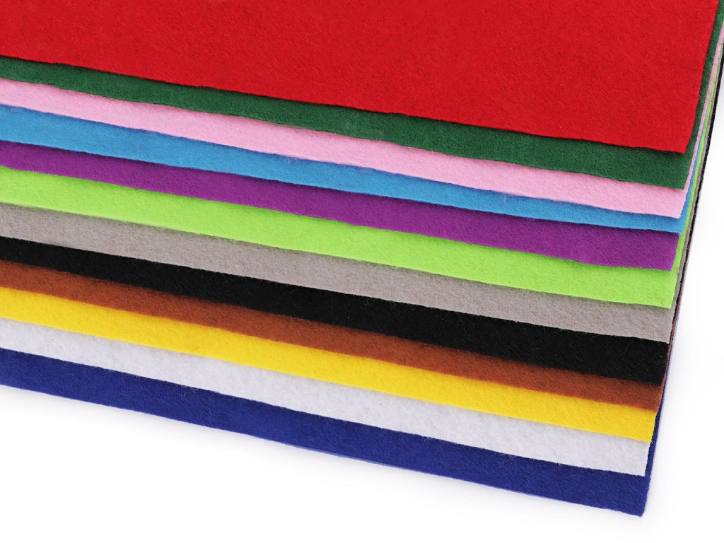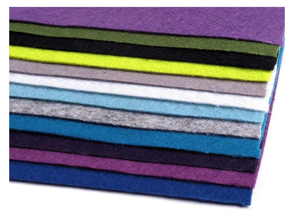 Lze kombinovat s dalšími výtvarnými materiály - plyšové drátky, ovčí rouno. Jeden kus obsahuje 0,06 m². Bílá plsť se materiálově jemně liší od jiných barev.