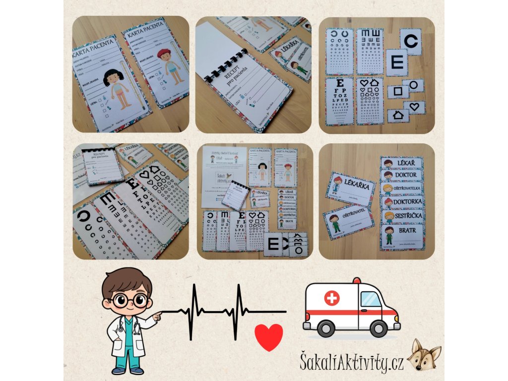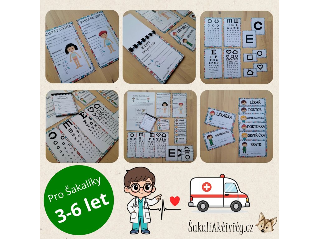 Tento výukový a zábavný materiál od www.ŠakalíAktivity.cz obohacuje oblíbenou hru na lékaře o realistické a hravé doplňky. Děti se přirozeně vžívají do rolí lékaře, pacienta i zdravotnického personálu a rozvíjejí fantazii i sociální dovednosti.