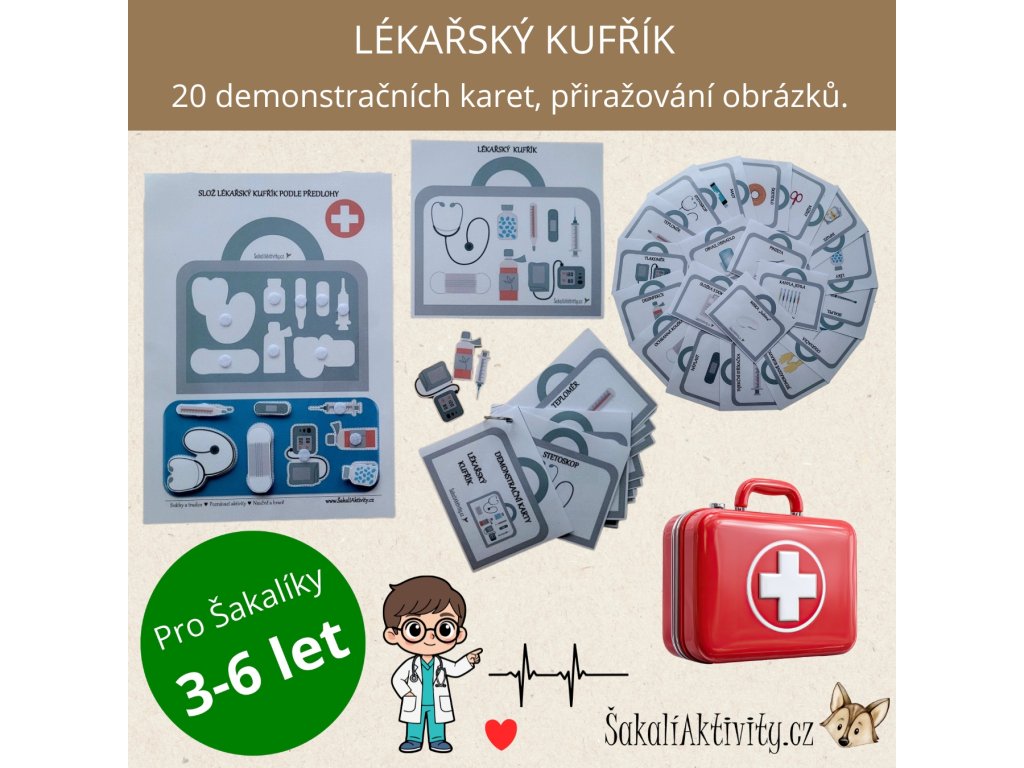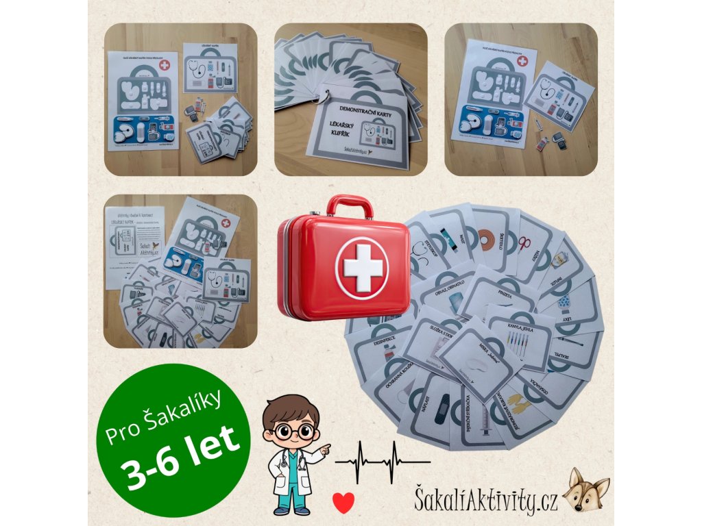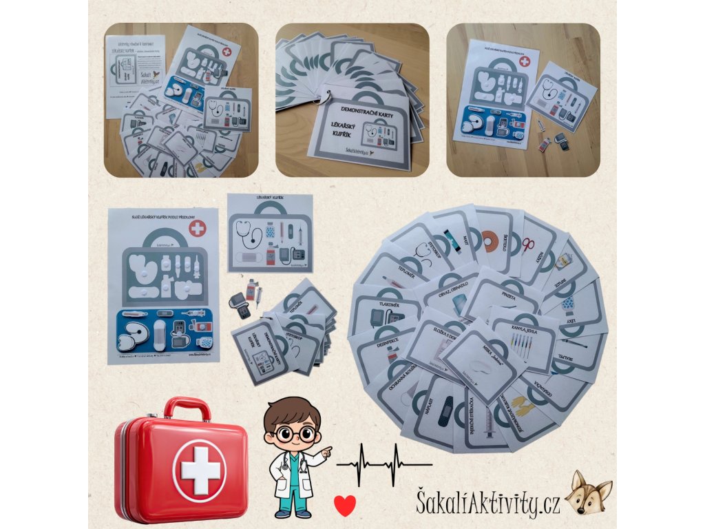 Tento výukový materiál od www.ŠakalíAktivity.cz rozšiřuje oblíbenou hru na lékaře a podporuje učení skrze hru a manipulaci. Děti se seznamují s lékařskými pomůckami, jejich názvy i využitím v praxi.