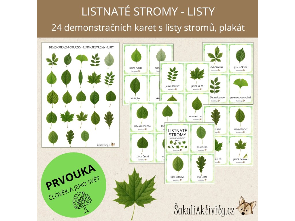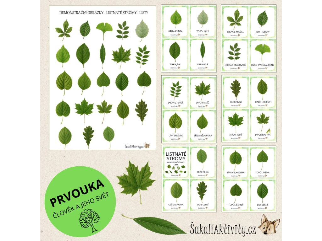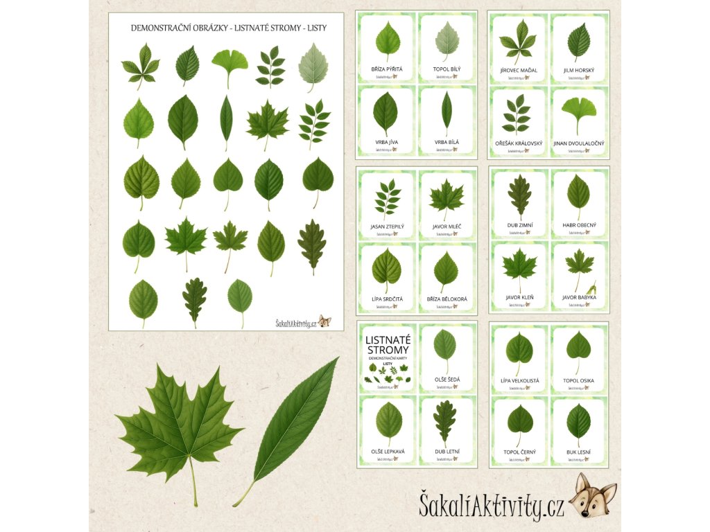 Demonstrační obrázky – listy listnatých stromů jsou vzdělávací materiál určený pro děti v mateřských i základních školách, školních družinách a domácí vzdělávání.