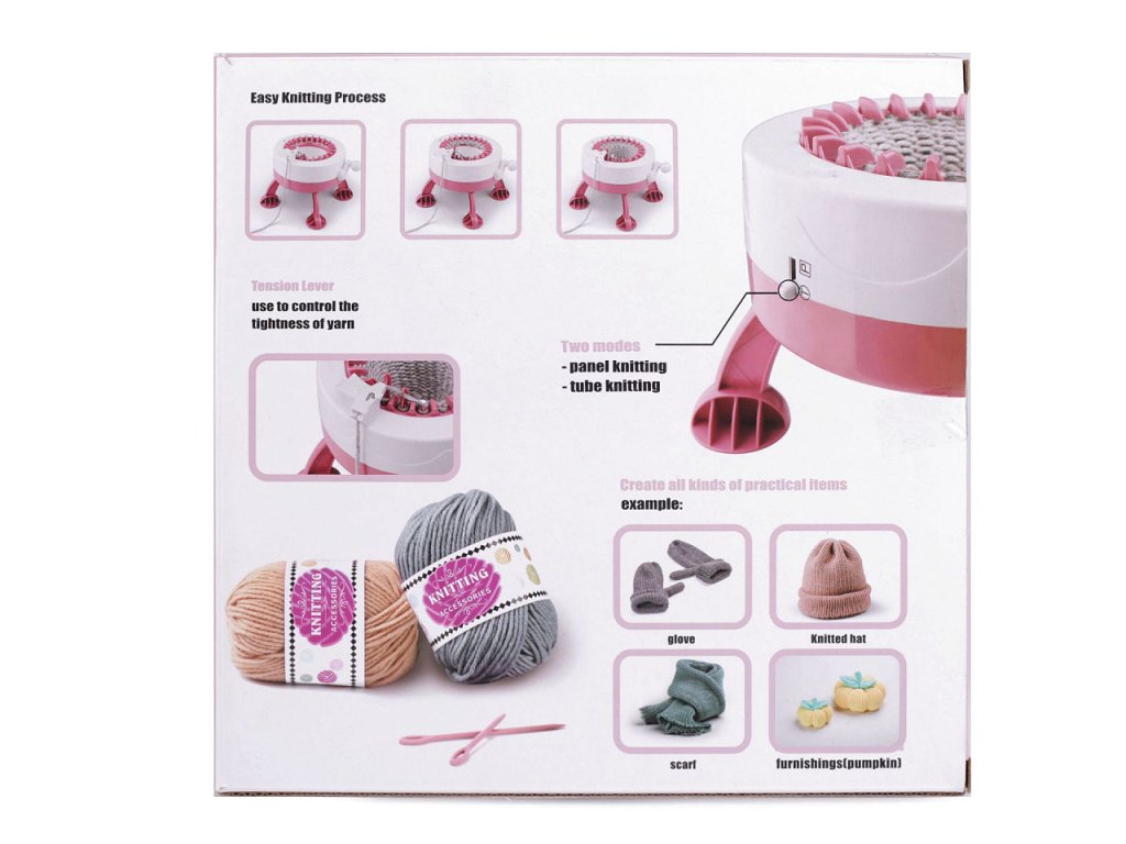 Balení obsahuje 1 pletací mlýnek, 1 plastovou jehlu na přízi, 1 plastový háček, 2 klubíčka příze, 4 pěnové přísavky pro lepší stabilitu mlýnku na stole. Průměr pletací části je 12 cm, dokola je 22 pletacích háčků (jehel). Mlýnek je vhodný pro děti od 8 let i pro dospělé.