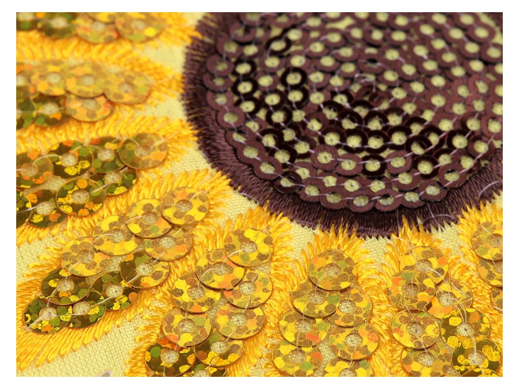 Nažehlovačka slunečnice se třpytí již z dálky. Je detailně zpracovaná, s flitry a plošnou výšivkou.