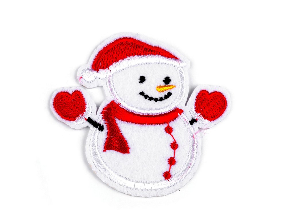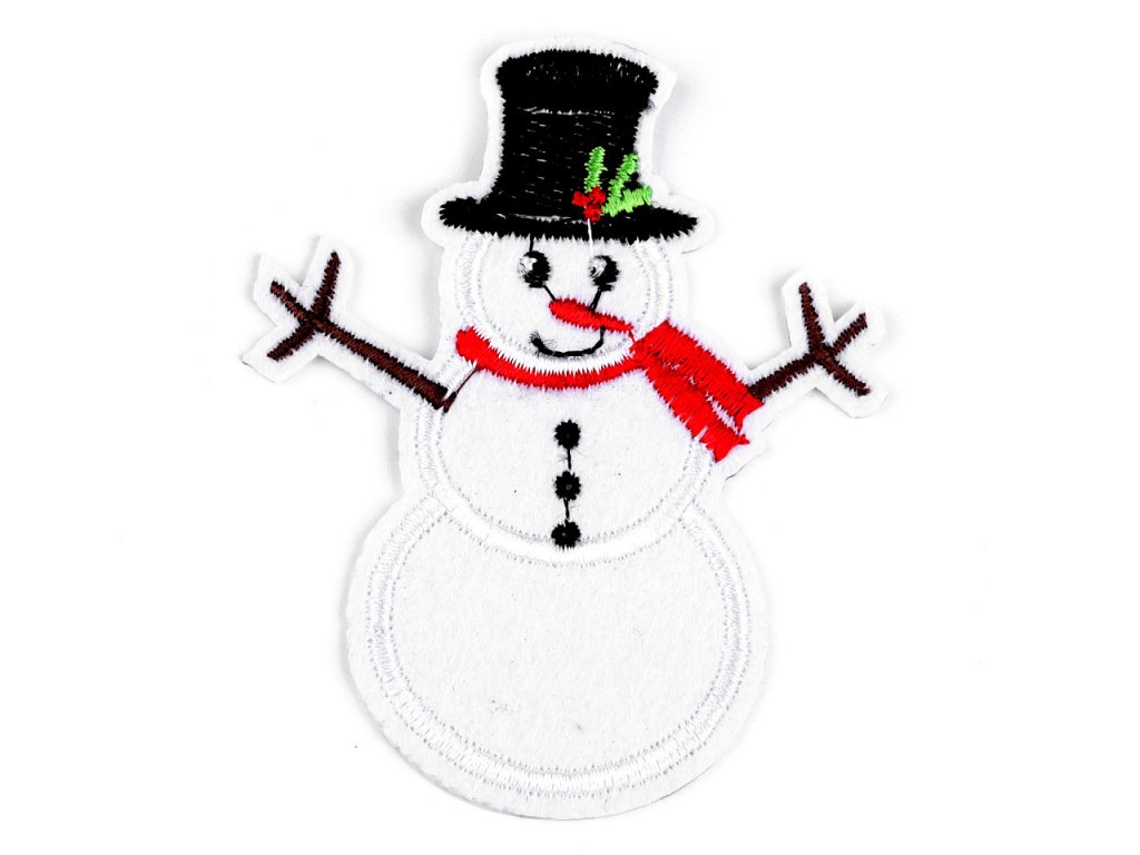 Nažehlovačka roztomilého sněhuláka má kvalitní provedení. Je vyšívaná, jemně se leskne.