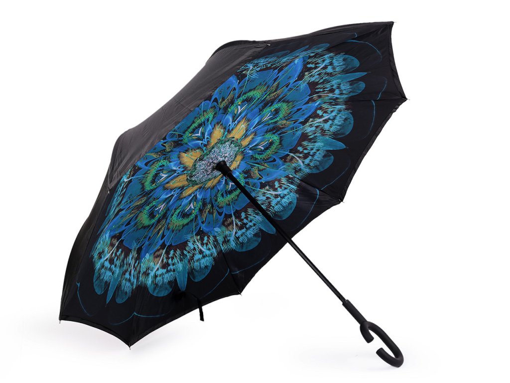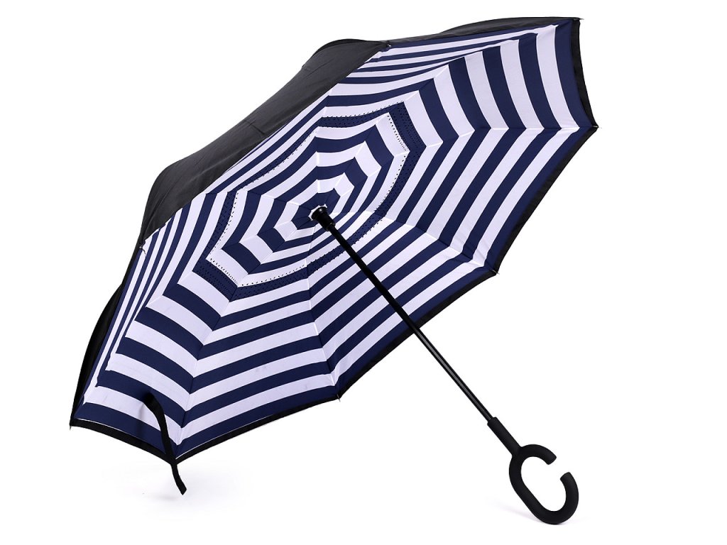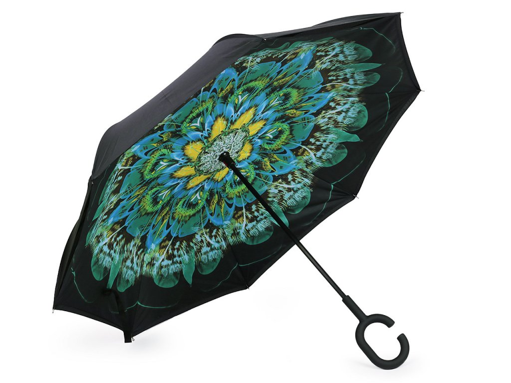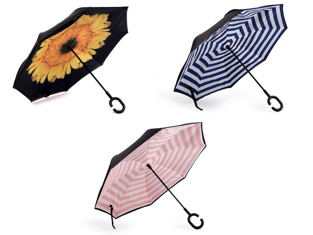 Obrácený deštník s barevným vnitřním potahem má revoluční řešení konstrukce. Díky opačnému otevírání a zavírání deštníku směrem vzhůru voda zůstane schovaná uvnitř v deštníku. Je to veliká výhoda např. když usedáte do automobilu, voda na vás již při zavírání nesteče, ale zůstane v deštníku.
