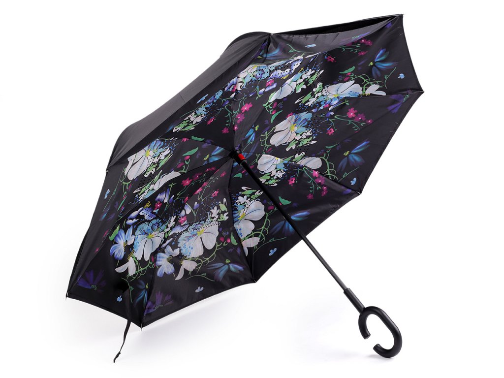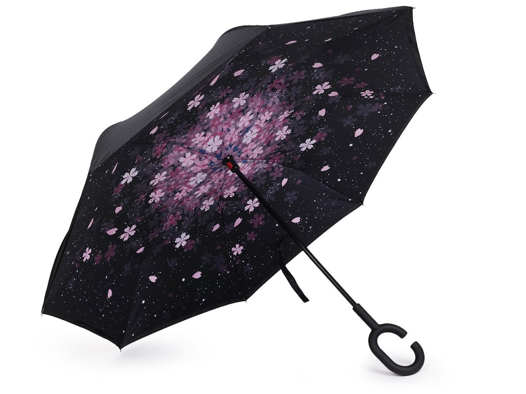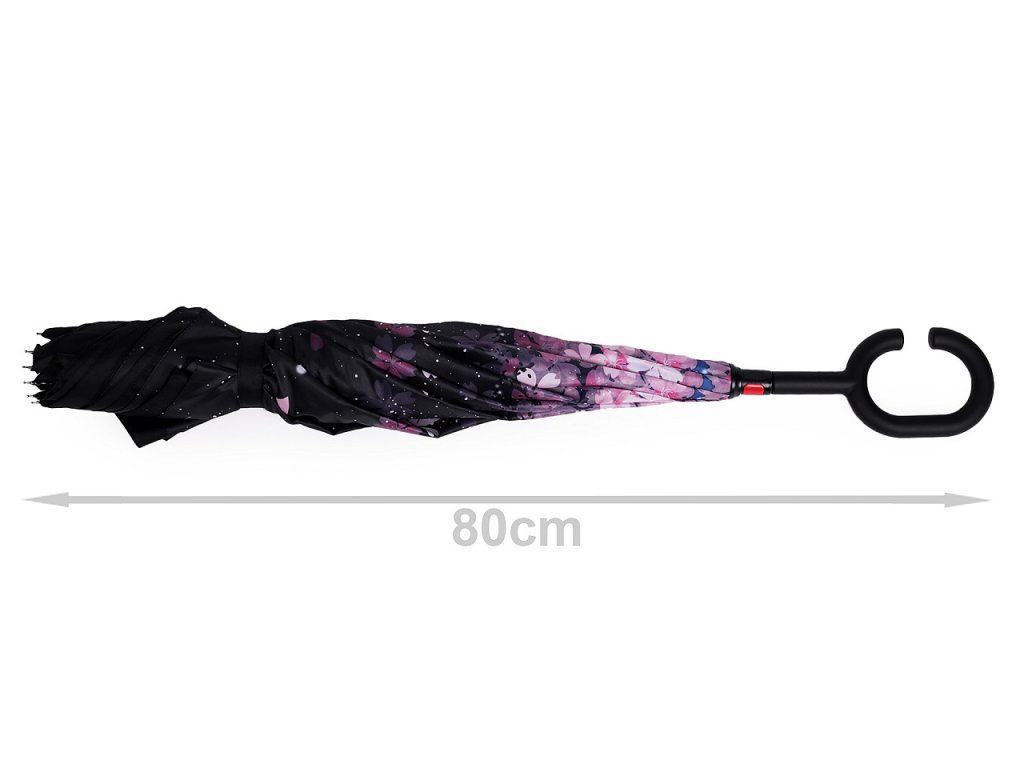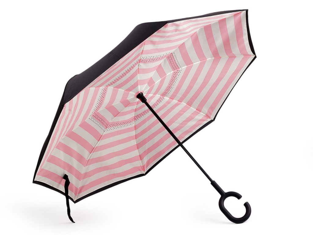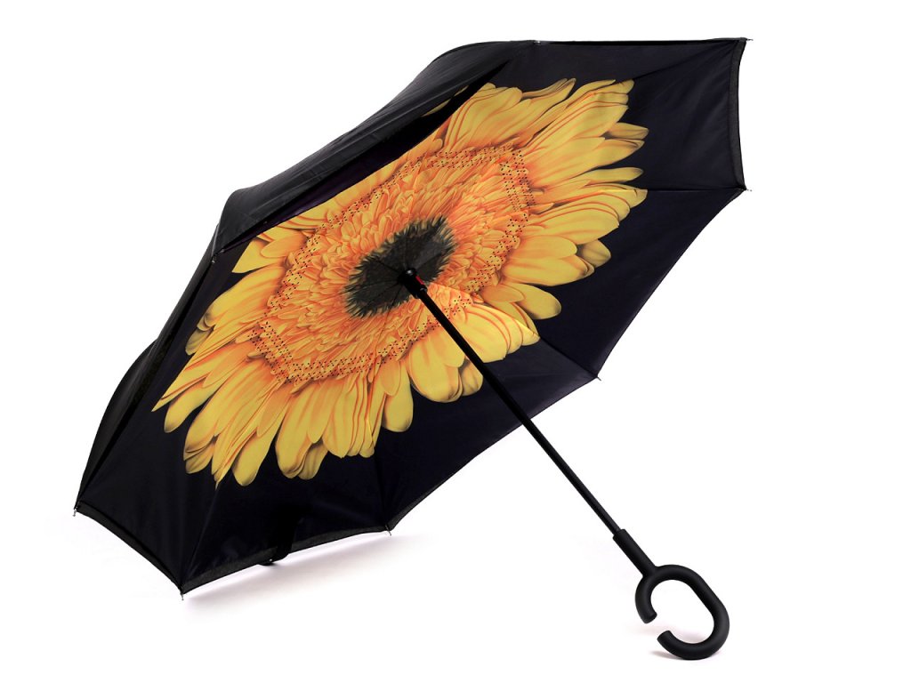 Obrácený deštník s barevným vnitřním potahem má revoluční řešení konstrukce. Díky opačnému otevírání a zavírání deštníku směrem vzhůru voda zůstane schovaná uvnitř v deštníku. Je to veliká výhoda např. když usedáte do automobilu, voda na vás již při zavírání nesteče, ale zůstane v deštníku.