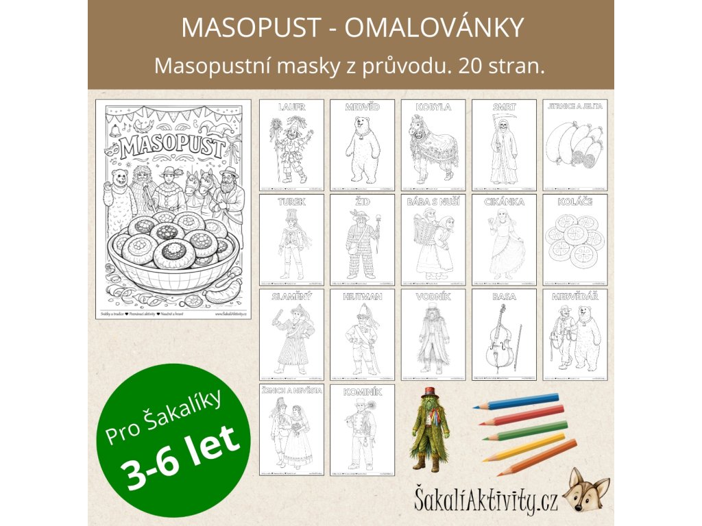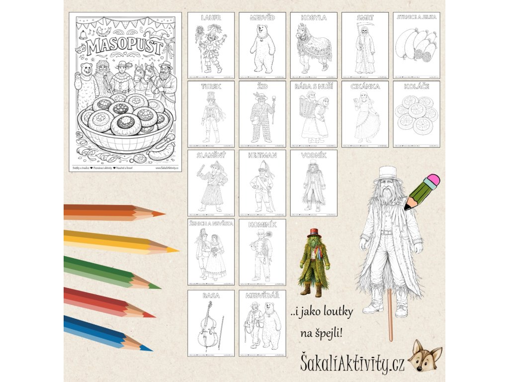 Součástí souboru je také omalovánkový plakát ve formátu A4 a motivy typických masopustních dobrot – koláče, jitrnice a jelita. Jednotlivé postavy lze po vybarvení vystřihnout a využít jako figurky nebo loutky k dalším hrám, dramatizaci nebo tematickým aktivitám.