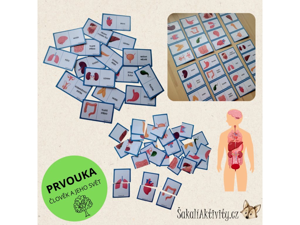 Soubor obsahuje celkem 32 + 32 karet se 16 základními vnitřními orgány, které jsou rozděleny na dvě části. Mladší děti skládají jednotlivé orgány z poloviny na polovinu podobně jako puzzle a rozvíjejí tak vizuální vnímání a jemnou motoriku. Starší děti přiřazují celý obrázek orgánu k jeho názvu a využívají aktivitu v rámci prvouky nebo přírodovědy.