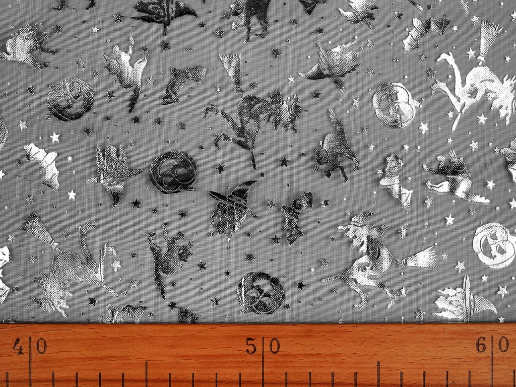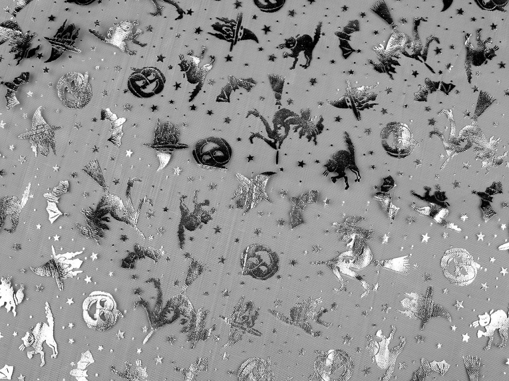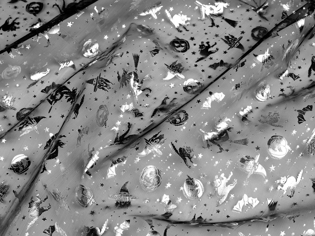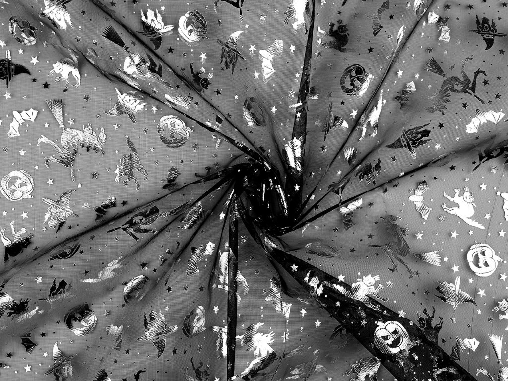 Organza s čarodějnickým potiskem je perfektní k halloweenskému aranžování, ozdobení stolu, k výrobě karnevalových kostýmů nebo dekoračních postaviček (čarodějnic, ježibab, skřetů apod.). Potisk je metalický.