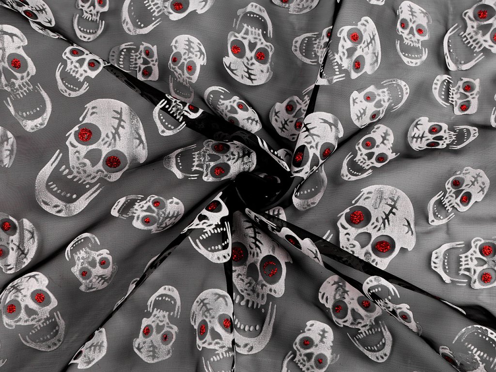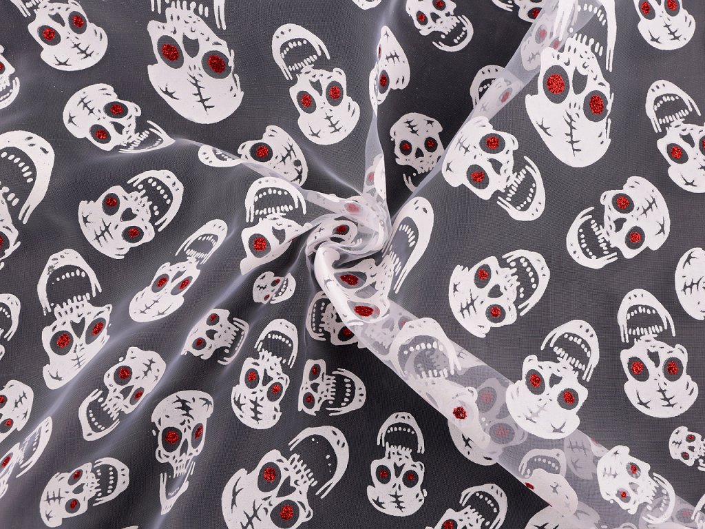 Organza s potiskem lebek se skvěle hodí k halloweenskému aranžování, ozdobení stolu nebo k výrobě karnevalových kostýmů.