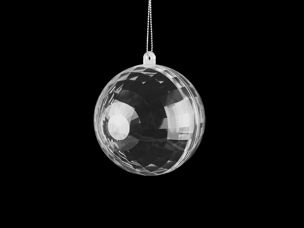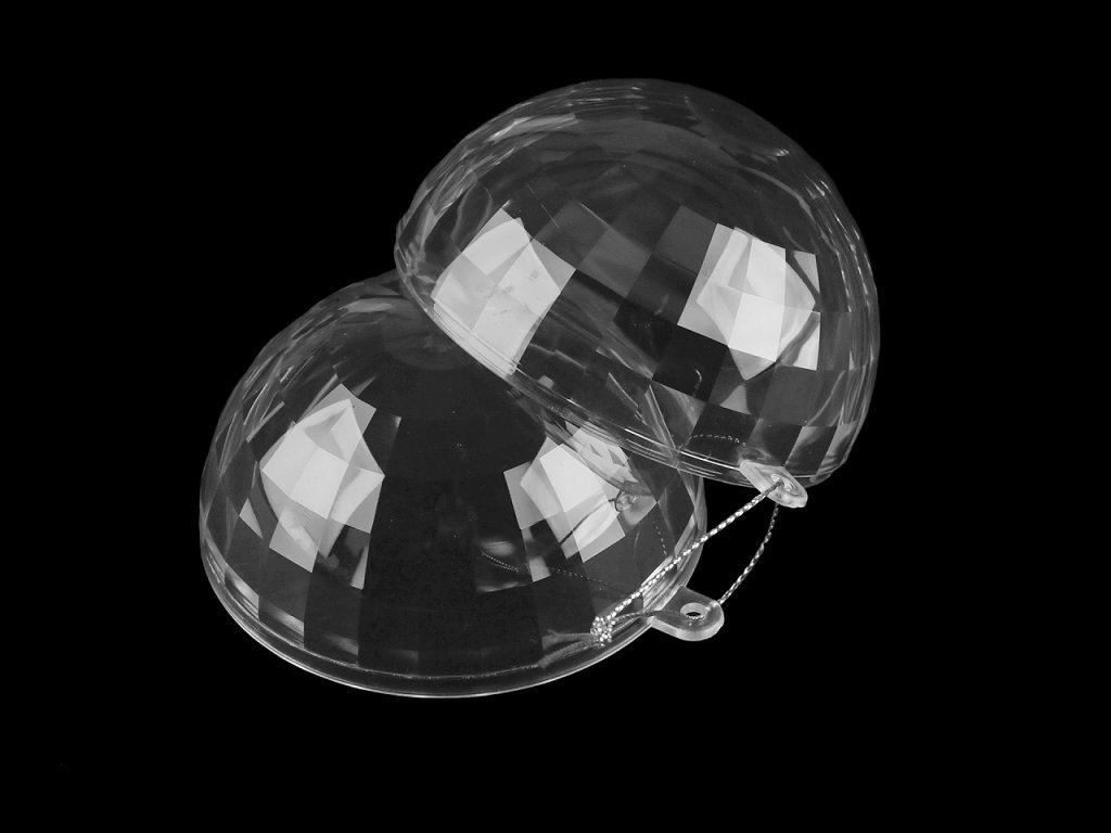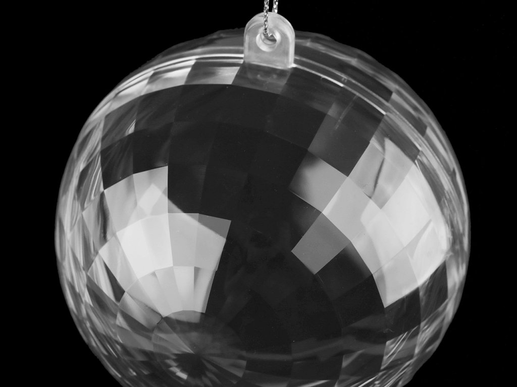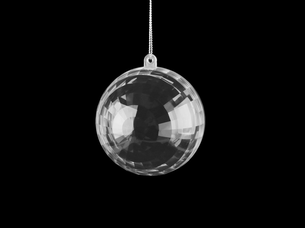 Průhledná plastová koule s lomenými ploškami se skládá ze dvou dílů, které lze spojit.