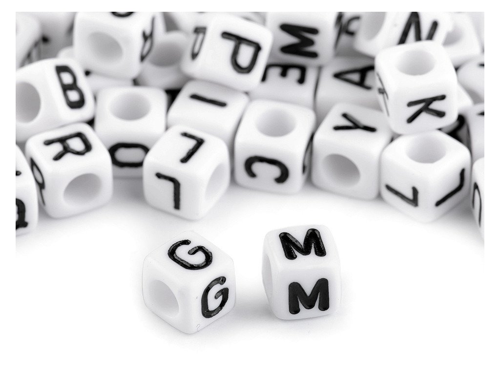 Korálky mají tvar kostky. Písmena jsou na všech ploškách, chybí pouze na stranách s průvleky. Horizontálně umístěný průvlek umožňuje skládat z písmen slova, jména apod. Díky velkému průvleku se korálky hodí i na gumičkové náramky. Tělo korálku má bílou barvu, písmena jsou černá. Jako návlekový materiál můžete použít pruženky a silony, různé šňůrky, gumičky apod. V sáčku je mix různých písmen.