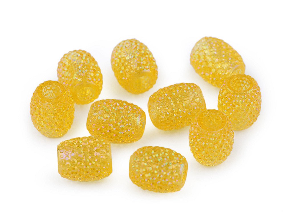 Transparentní korálky s velkým průvlekem ve tvaru olivy mají díky drobných plošek výrazný lesk. Navíc mají povrch s AB efektem, jenž způsobuje vysoký duhový třpyt korálů.