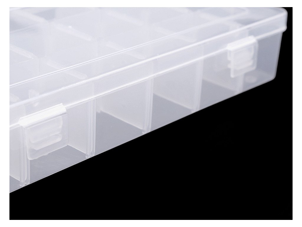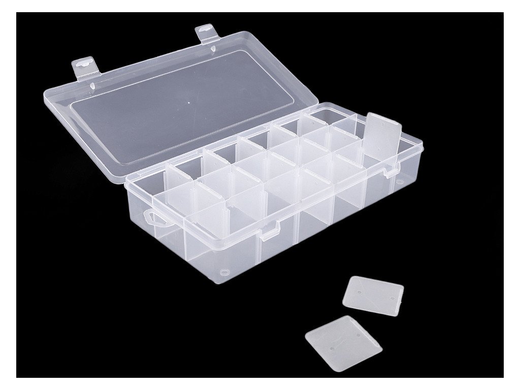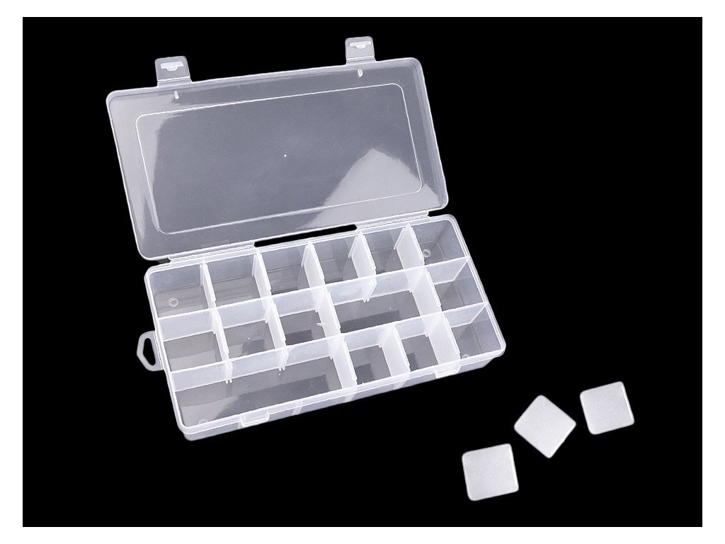 Přihrádky si můžete regulovat pomocí odstranitelných přepážek (3x dlouhé vcelku - odstranit nejdou, 15 x krátké jednotlivé - lze odstranit). Pokud odstraníte všechny malé přepážky, budete mít 3 přihrádky o velikosti 3,5 x 22,5 cm. Krabička je uzavíratelná.